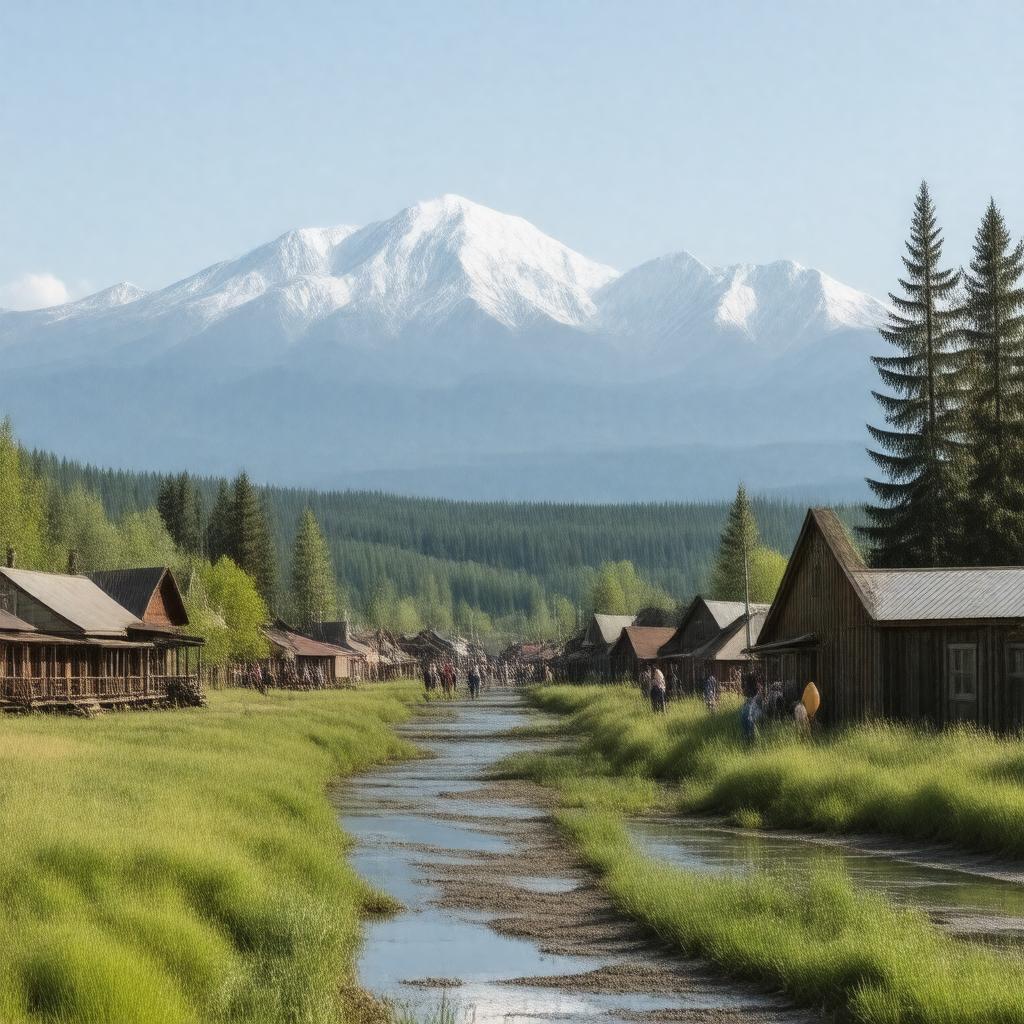 "Generate an image of a scenic view of Talkeetna, a small town in Alaska, with the majestic Denali mountain in the background. The image should feature a quaint, rustic town with wooden buildings, surrounded by lush greenery and waterways, with a few tourists and locals milling about. Incorporate a vintage-style airport and a train in the distance, hinting at the town's connection to the Alaska Railroad and Talkeetna Airport. The style should be realistic, with a warm and inviting color palette, evoking a sense of natural beauty and small-town charm."