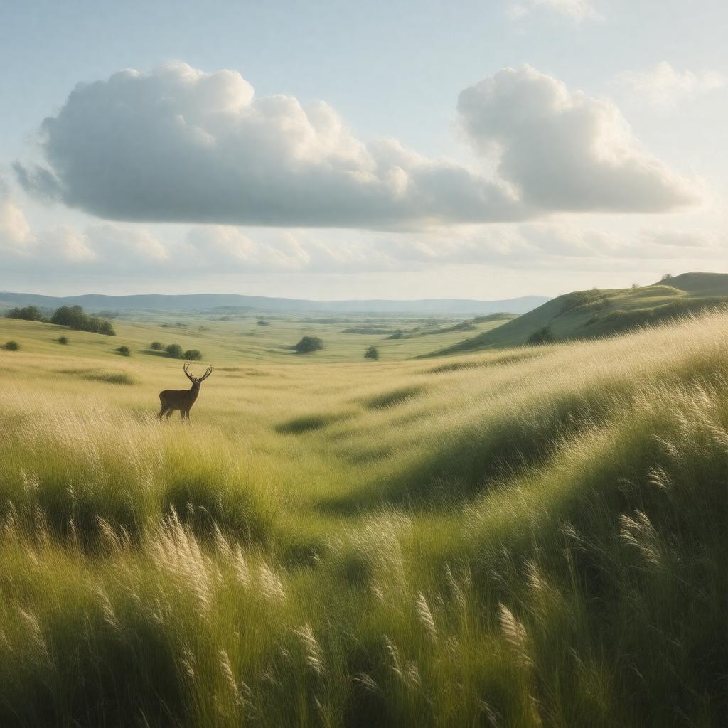 "Generate an image of a serene Tallgrass prairie landscape, characterized by rolling hills of tall grasses, including big bluestem, switchgrass, Indian grass, and little bluestem, under a vast sky with a few scattered clouds, in a realistic and naturalistic style, with a mix of vibrant greens and warm golden hues, and featuring some wildlife such as a white-tailed deer, a greater prairie chicken, and a few butterflies, in a humid continental climate with a subtle hint of a recent fire regime, set in the central United States."