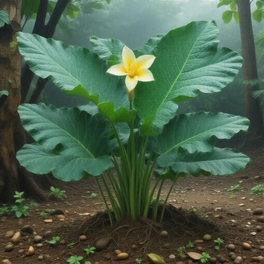 "Generate an image of a Colocasia esculenta, also known as Taro, plant with heart-shaped leaves and a yellowish-white flower, growing in a tropical region with wet conditions and well-drained soil, with a few edible corms and leaves visible, in a realistic style."