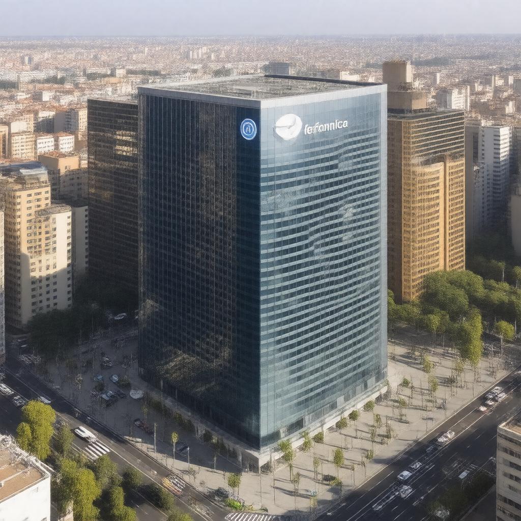 "Generate an image of the Telefónica headquarters in Madrid, Spain, a modern and sleek skyscraper with the company's logo prominently displayed on the facade, surrounded by bustling city streets and incorporating elements that reflect the company's history and global presence as one of the largest telecommunications companies in the world."