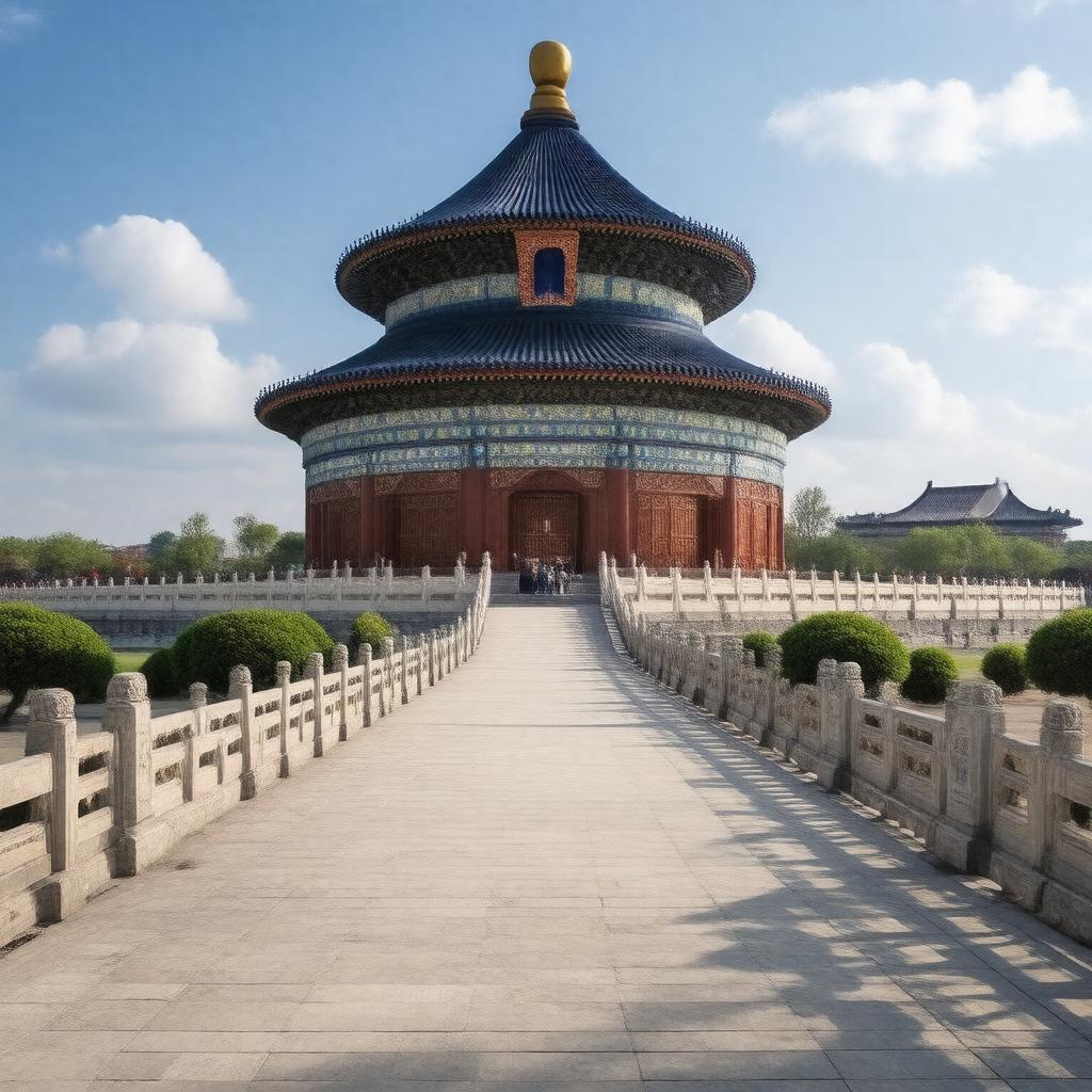 "Generate a photorealistic image of the Temple of Heaven, a majestic complex of Chinese architecture with a triple-gabled circular building, blue tiled roofs, and a symbolic layout representing Heaven and Earth, set amidst a serene park in Beijing, China, during a sunny day with a few wispy clouds, capturing its grandeur and historical significance as a UNESCO World Heritage Site and a major national historical and cultural site."