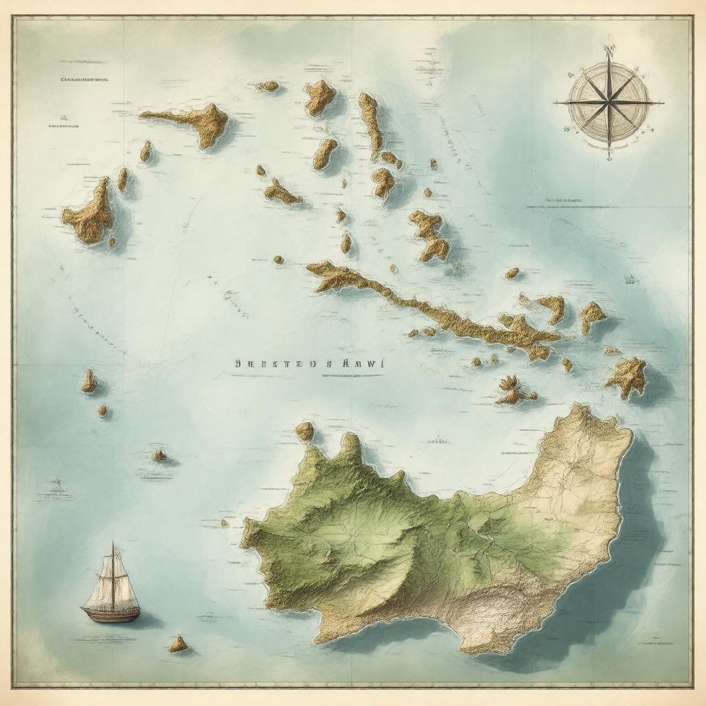 "Create an image of a map of the Territory of Hawaii, showcasing its location in the Pacific Ocean, with the main islands of Hawaiʻi, Maui, Oʻahu, Kauaʻi, Molokaʻi, Lānaʻi, Niʻihau, and Kahoʻolawe visible, surrounded by a subtle nautical theme, with a classic cartographic style reminiscent of the early 20th century, highlighting the territory's history and geography during its existence from 1898 to 1959."