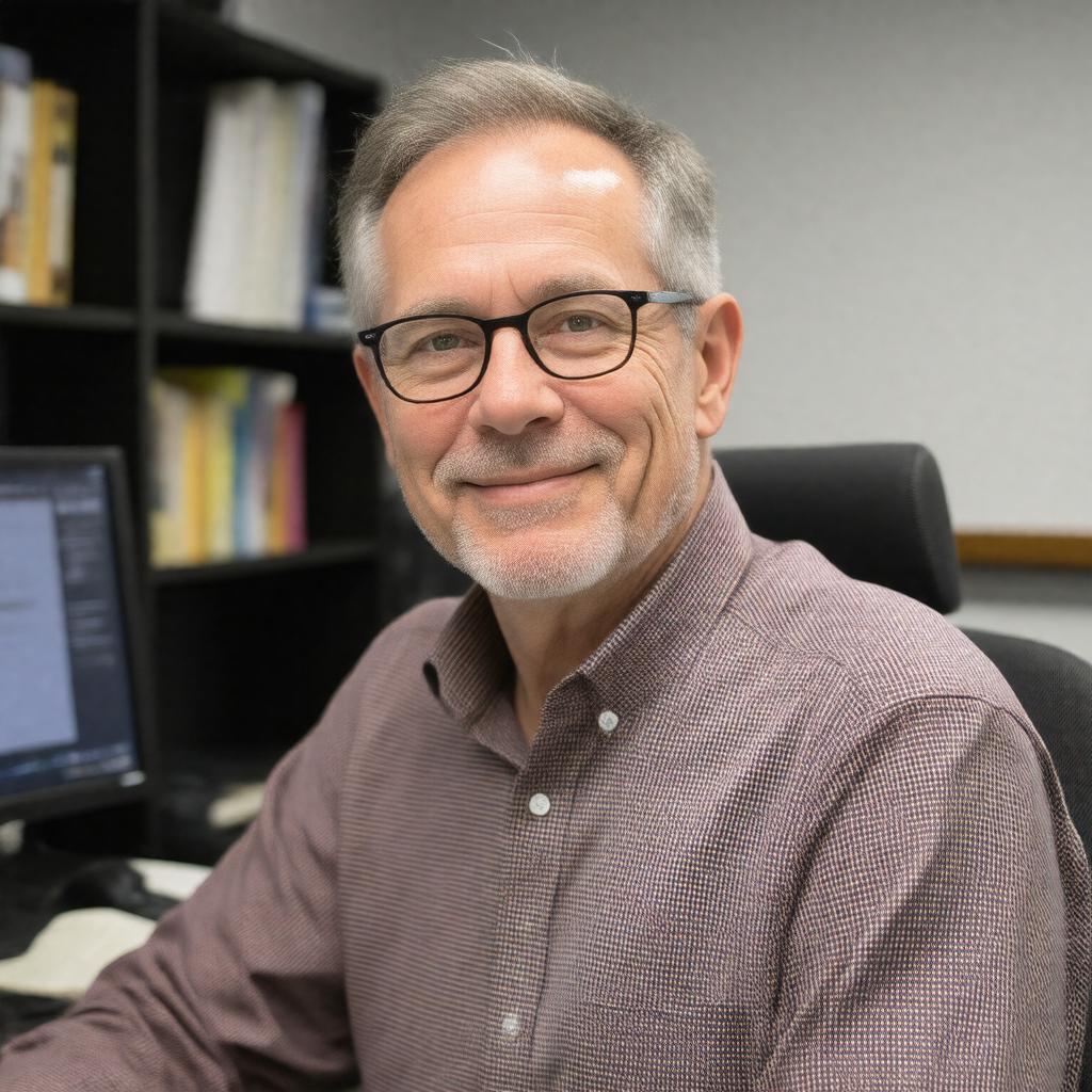 A realistic portrait of Terry Winograd, a middle-aged American man with a gentle smile, wearing a pair of glasses and a collared shirt, sitting in front of a computer screen with a subtle background of academic surroundings, such as books and university decor, in a style that reflects his profession as a computer scientist and professor.