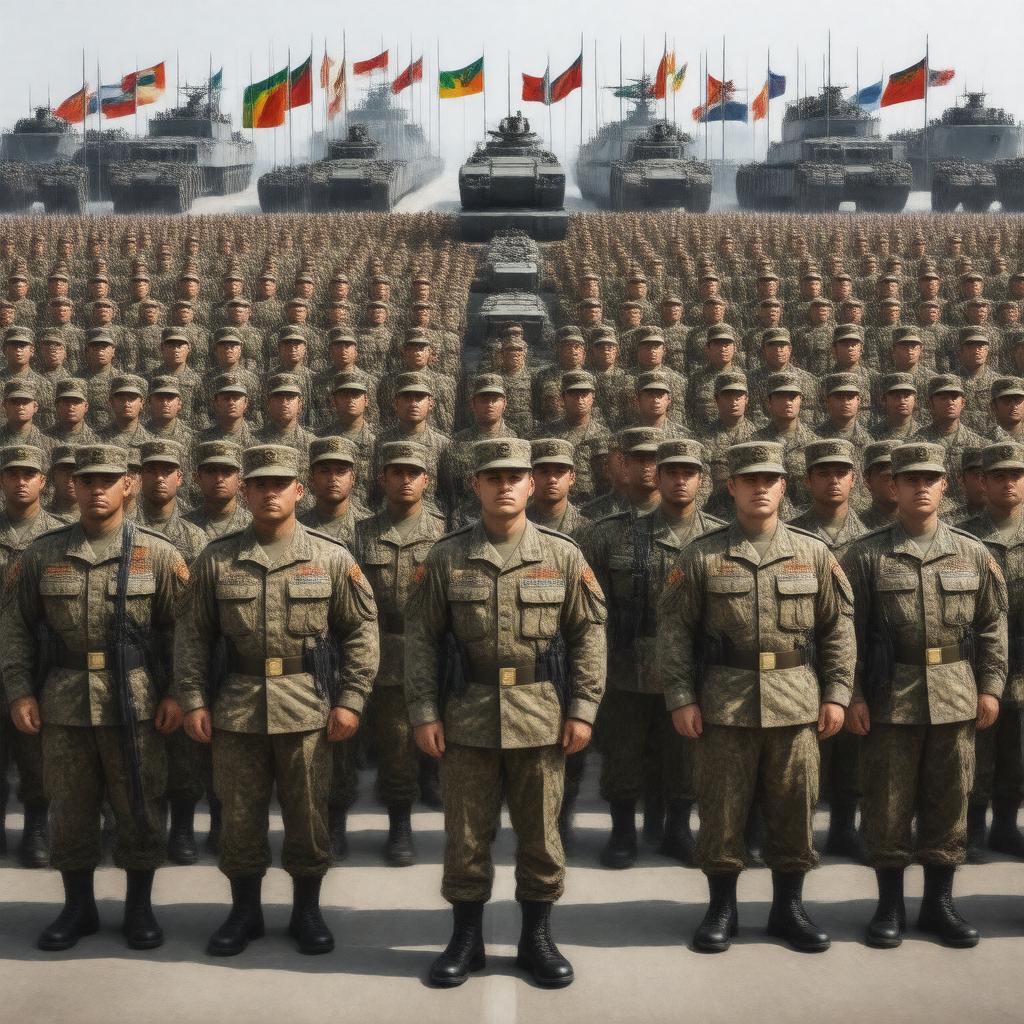 Generate an image of a large, diverse group of soldiers in various uniforms, standing at attention in front of a backdrop of different national flags, representing the collective entity of The Army as a military organization, with a style that blends realism and symbolic representation, incorporating elements such as tanks, aircraft, and ships in the background to signify the scope and reach of land-based military forces.