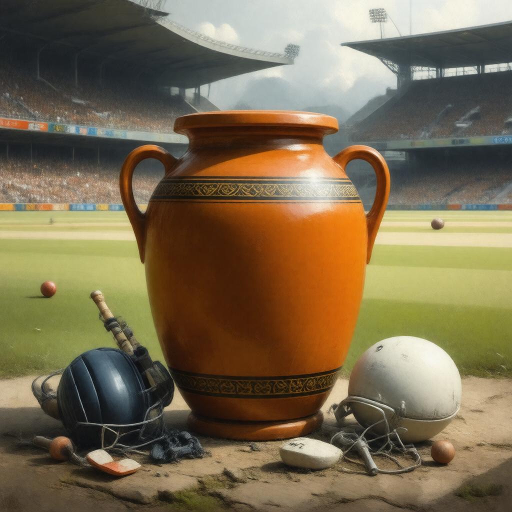 "Generate an image of a terracotta urn, symbolizing The Ashes, surrounded by cricket equipment, with a subtle background of a cricket stadium, representing the iconic rivalry between England and Australia in cricket, in a realistic and dignified style."