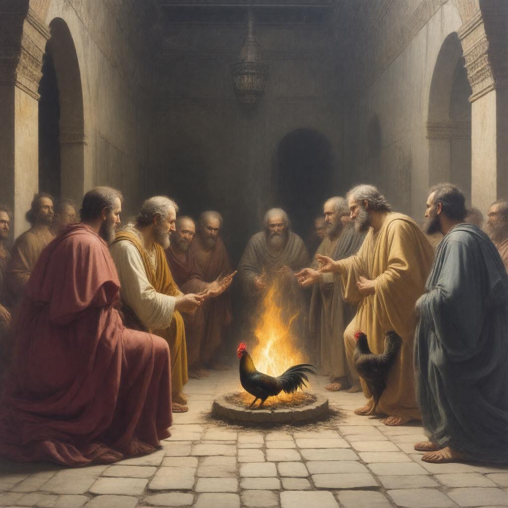 "Generate an image depicting a dramatic scene of The Denial of Saint Peter, set in a dimly lit courtyard in Jerusalem, with Saint Peter and others around a fire, and a rooster in the background, symbolizing the moment of denial, in a Baroque style reminiscent of Caravaggio's works."
