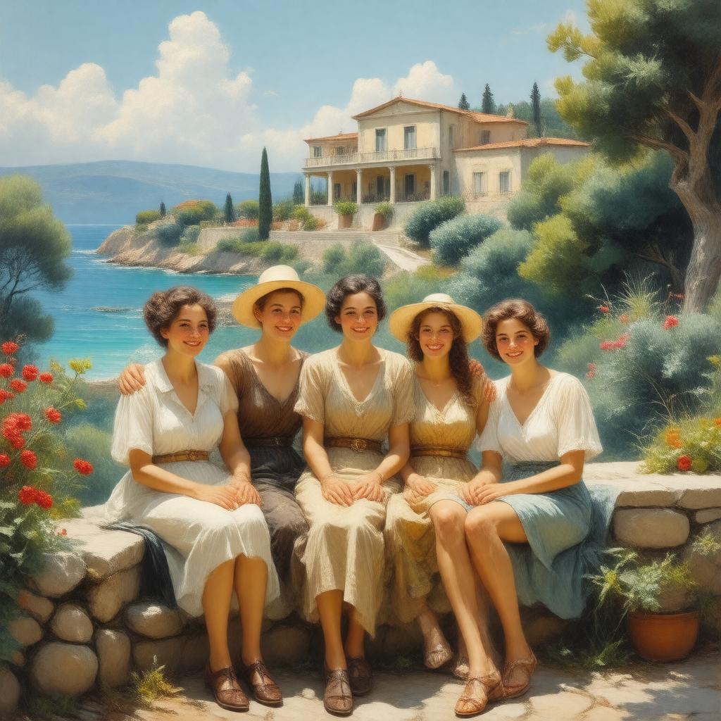 "Create an image of a warm and vibrant 1930s Greek landscape with a large villa in the background, surrounded by lush greenery and a turquoise sea. In the foreground, depict the Durrell family - Louisa, Larry, Leslie, Margo, and Gerry - sitting together on a stone wall or steps, smiling and relaxed, evoking a sense of joy and adventure. The style should be reminiscent of a classic British television series, with a mix of realism and lightheartedness, capturing the essence of the beloved comedy-drama, The Durrells."