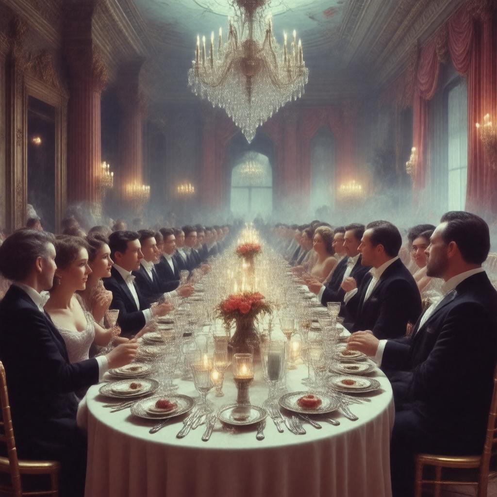 "Generate an image of a surreal, lavish dinner party scene with a group of upper-class guests trapped in a luxurious mansion, unable to leave, with a sense of unease and discomfort, evoking the themes of social satire, absurdism, and class critique, in the style of a still from a 1960s surrealist film, with a muted color palette and a hint of mystery and chaos."