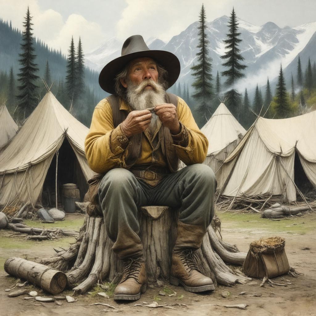"Create an image of a chaotic and comedic scene set during the Klondike Gold Rush, with a lone prospector, dressed in worn and tattered clothing, sitting on a tree stump, eating a shoe, surrounded by gold rush era tents, shanties, and makeshift camps, with a backdrop of rugged Alaskan wilderness, capturing the themes of survival, loneliness, hope, and romance, in a style reminiscent of silent film era illustrations."