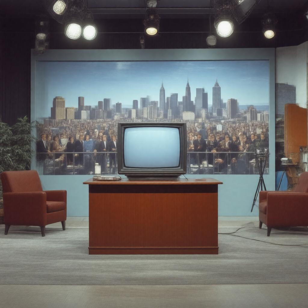 "Generate an image of a classic daytime talk show setting, specifically a 1970s-era television studio with a large audience and a desk for the host, Mike Douglas, in the center. Incorporate iconic elements such as a cityscape backdrop, a television screen or camera in the foreground, and a sense of lively discussion and debate. Style: nostalgic, retro, and realistic, reminiscent of a bygone era in American television history."