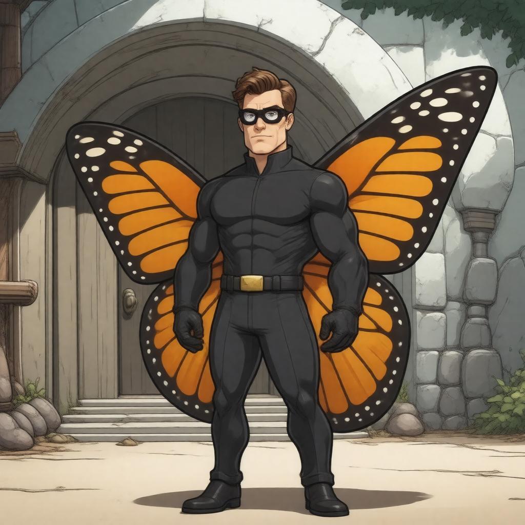 "Generate an image of The Monarch, a male fictional character and antagonist from The Venture Bros., standing in front of The Cocoon, his base of operations. He is wearing a monarch butterfly costume and has brown hair. In the background, a hint of his incompetent henchmen and elaborate villainous schemes can be seen. The style should be cartoonish and comedic, matching the tone of The Venture Bros. series."
