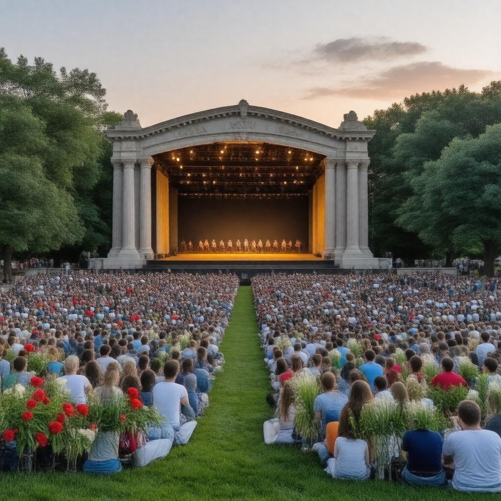 "Generate an image of The Muny, a historic outdoor musical theatre located in Forest Park, St. Louis, Missouri, with a large crowd seated in its 11,000-seat venue, surrounded by lush greenery and vibrant flowers, under a warm summer evening sky, with a classic musical theatre-style stage and architectural elements in the background, symbolizing its rich history and tradition of producing musical theatre productions since 1917."