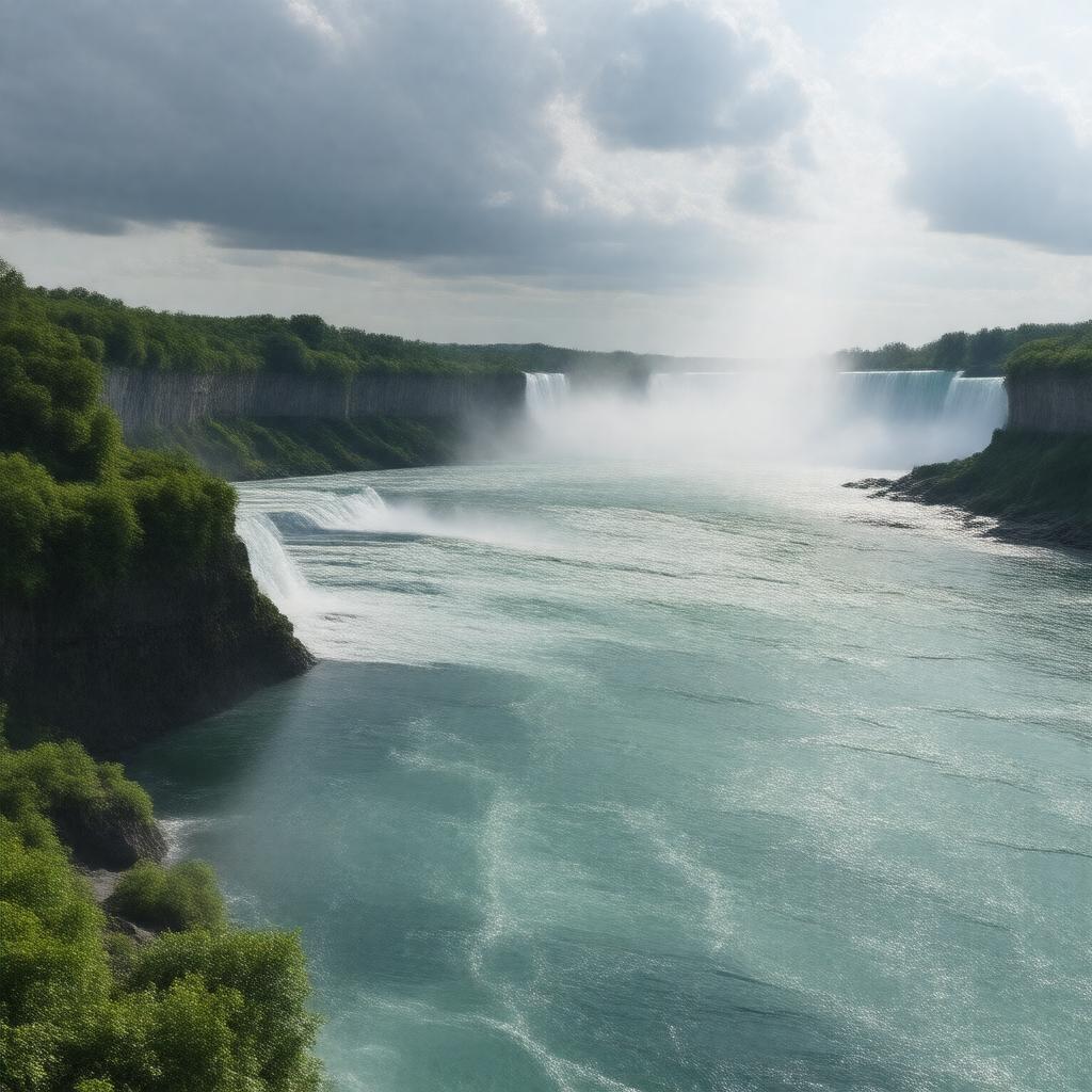 "Generate an image of a serene and majestic river, specifically the Niagara River, flowing through the North American landscape, forming part of the border between the United States and Canada, with a notable drop of Niagara Falls in the background, surrounded by lush greenery and mist, under a partly cloudy sky with a few sun rays peeking through, in a realistic style."