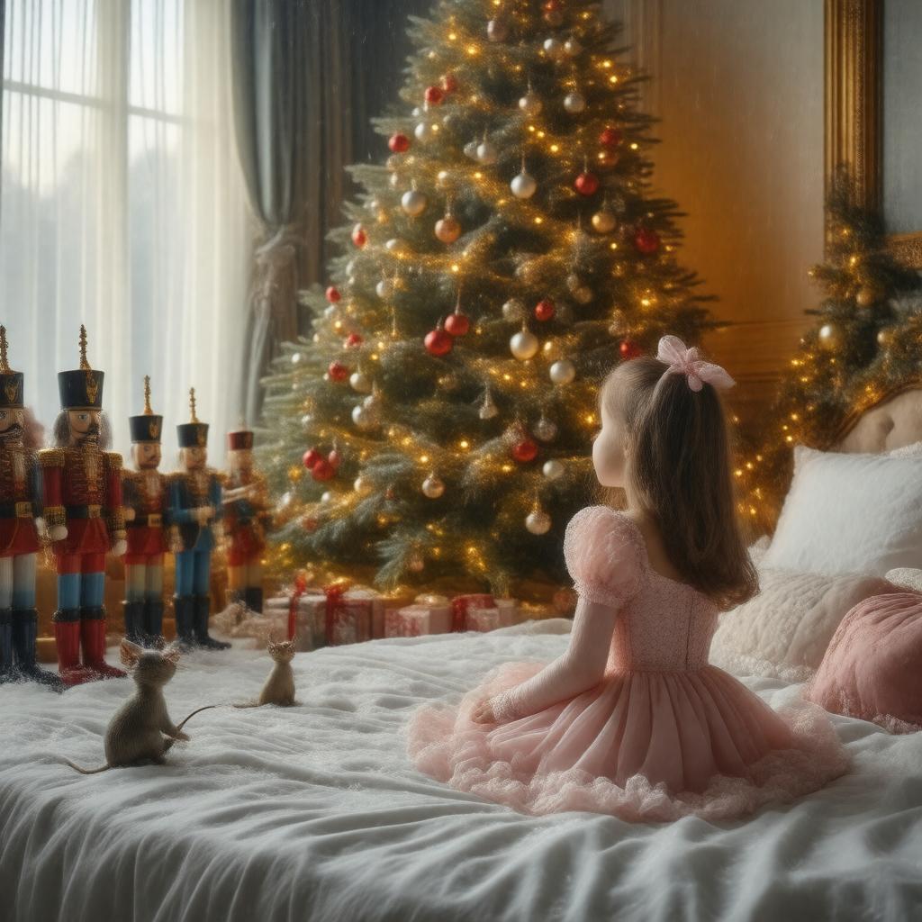 "A festive and magical scene from a classical ballet, set in a lavish German living room on Christmas Eve, with a large Christmas tree, decorated with lights and ornaments, in the center. A young girl, Clara, sits on the edge of her bed, wearing a nightgown and a bow in her hair, staring at a Nutcracker doll given to her by her mysterious godfather, Drosselmeyer. In the background, a group of toy soldiers, led by the Nutcracker Prince, prepare to battle the Mouse King and his mice. The style should be reminiscent of traditional Russian ballet, with intricate details and vibrant colors, evoking the spirit of Pyotr Ilyich Tchaikovsky's iconic score."