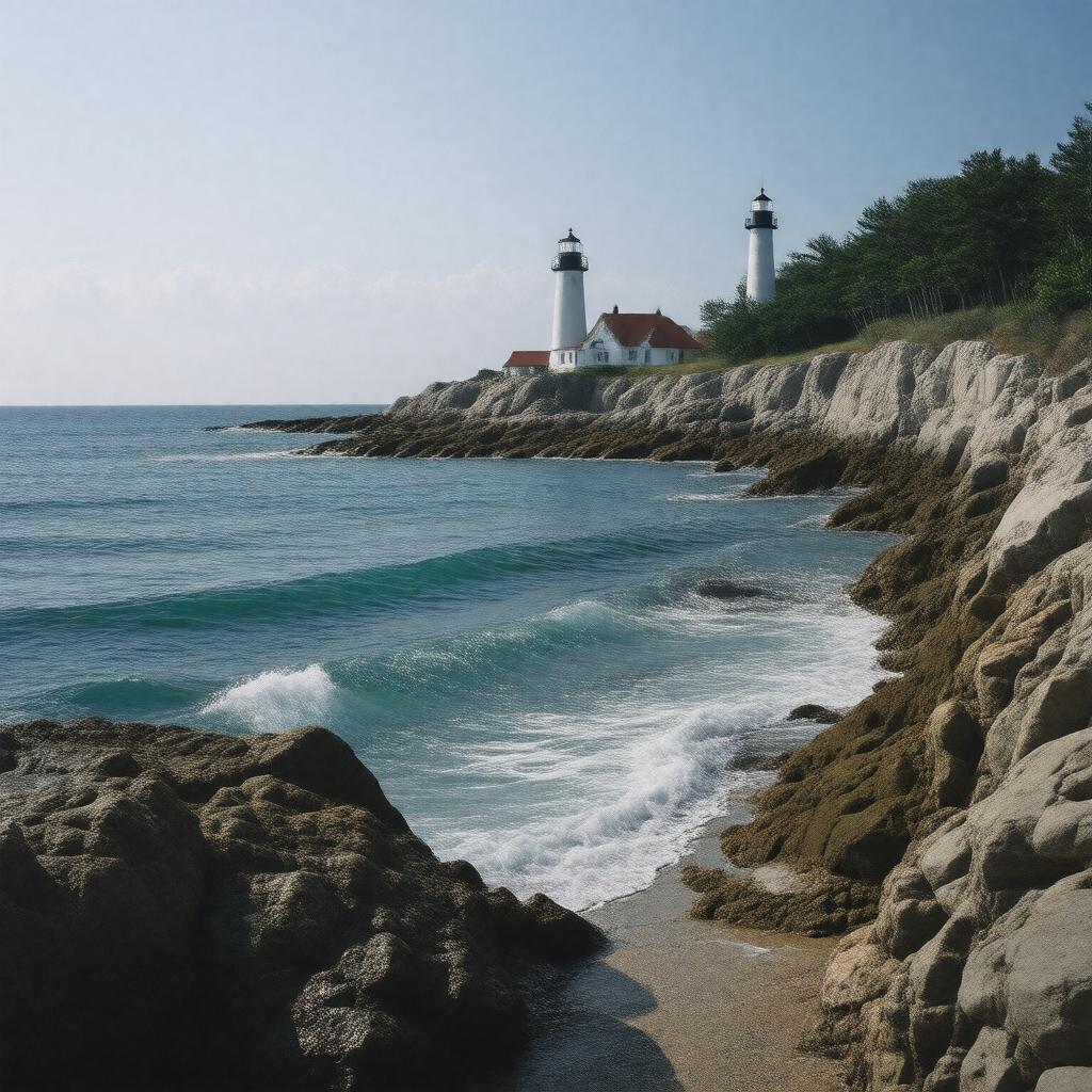 "Generate an image of a serene coastline with a scenic beach, rocky shores, and a picturesque lighthouse in the distance, representing the nickname 'The Ocean State' for Rhode Island, with a warm and inviting New England atmosphere, in a realistic style."
