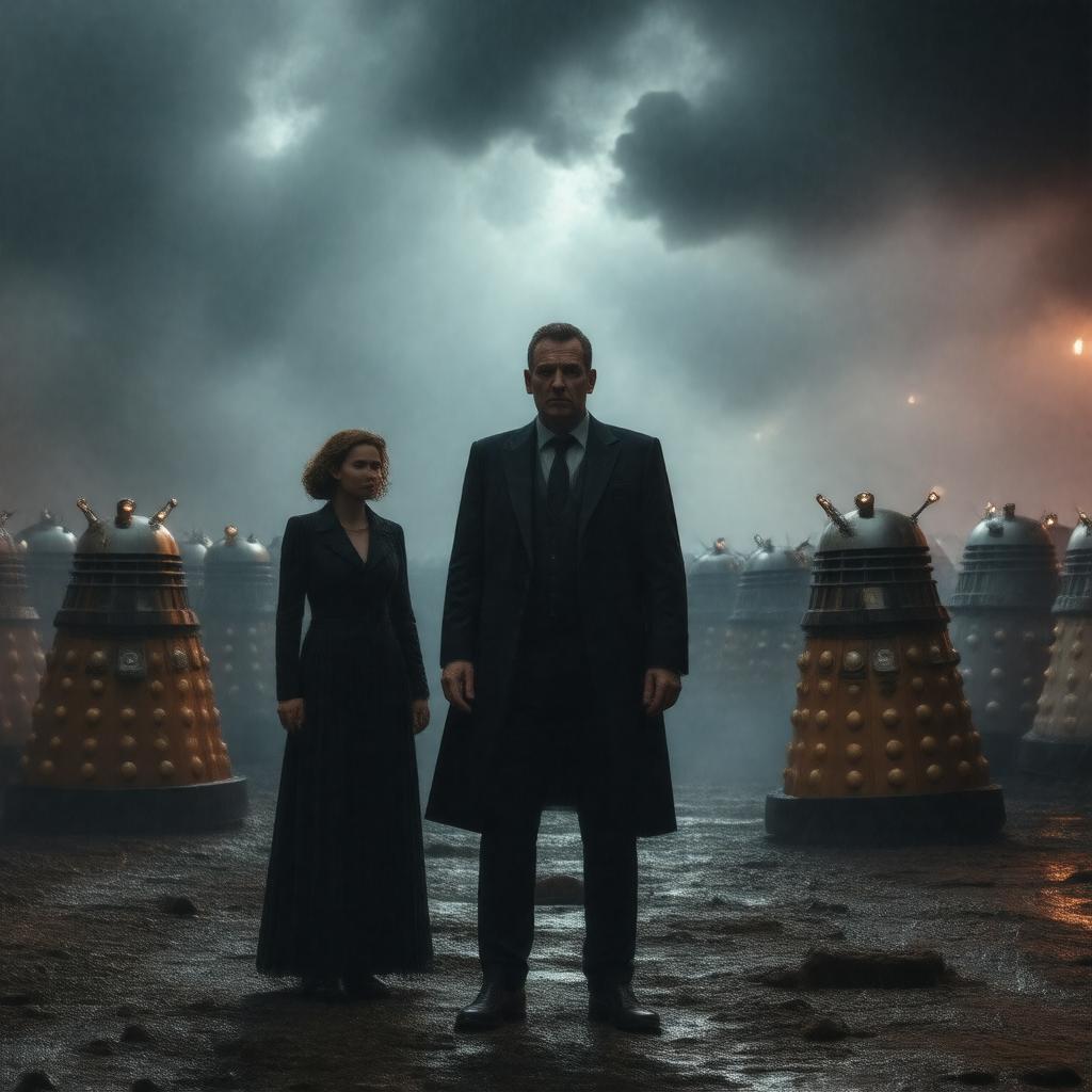 "Generate an image of a dramatic scene from a British science fiction television series, specifically the 13th episode of the 1st series, featuring the Ninth Doctor, Rose Tyler, and Jack Harkness standing together, with Daleks in the background, amidst a dark and ominous atmosphere, capturing the emotional intensity of the Doctor's regeneration, in a style reminiscent of a still from a TV show."