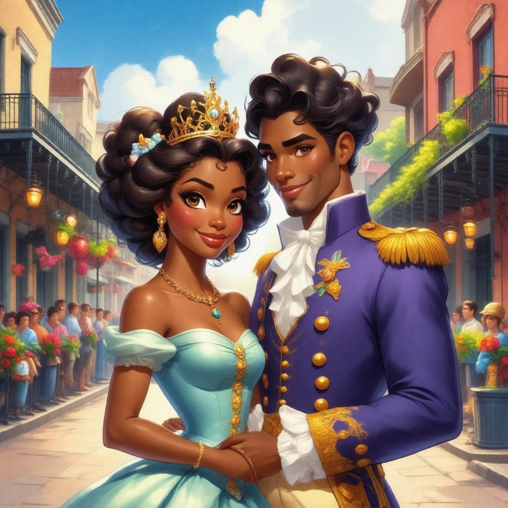 "An vibrant, colorful illustration of Tiana, the African-American Disney Princess, and Prince Naveen standing together in their royal attire, surrounded by jazz-inspired elements and New Orleans architecture, in a whimsical, dreamy style reminiscent of traditional animation, capturing the themes of perseverance, love, and transformation from the Disney animated film 'The Princess and the Frog'."