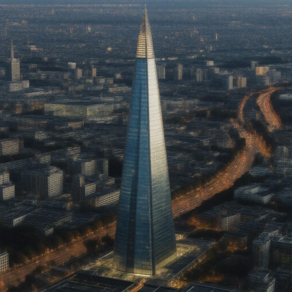 "Generate a realistic Neo-futuristic image of The Shard, a 310-meter-tall skyscraper located at 32 London Bridge Street in London, United Kingdom, with a distinctive pyramidal shape and a shiny glass exterior, surrounded by the London cityscape, with the observation deck 'The View from The Shard' visible, at dusk with city lights illuminating the building."