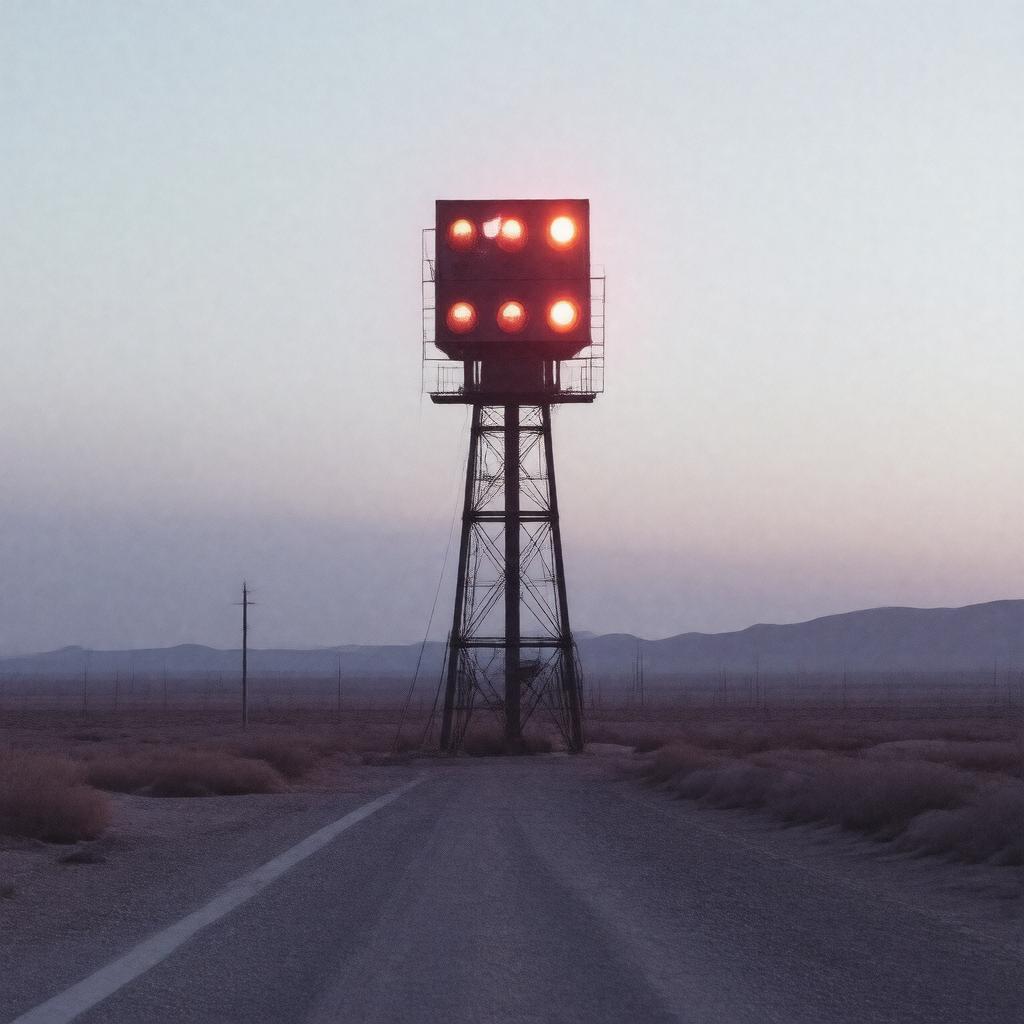 "Generate an image of a mysterious and ominous roadside signal tower at dusk, set against a desert landscape, evoking a sense of sci-fi foreboding, in a cinematic style reminiscent of the 2014 film 'The Signal'."