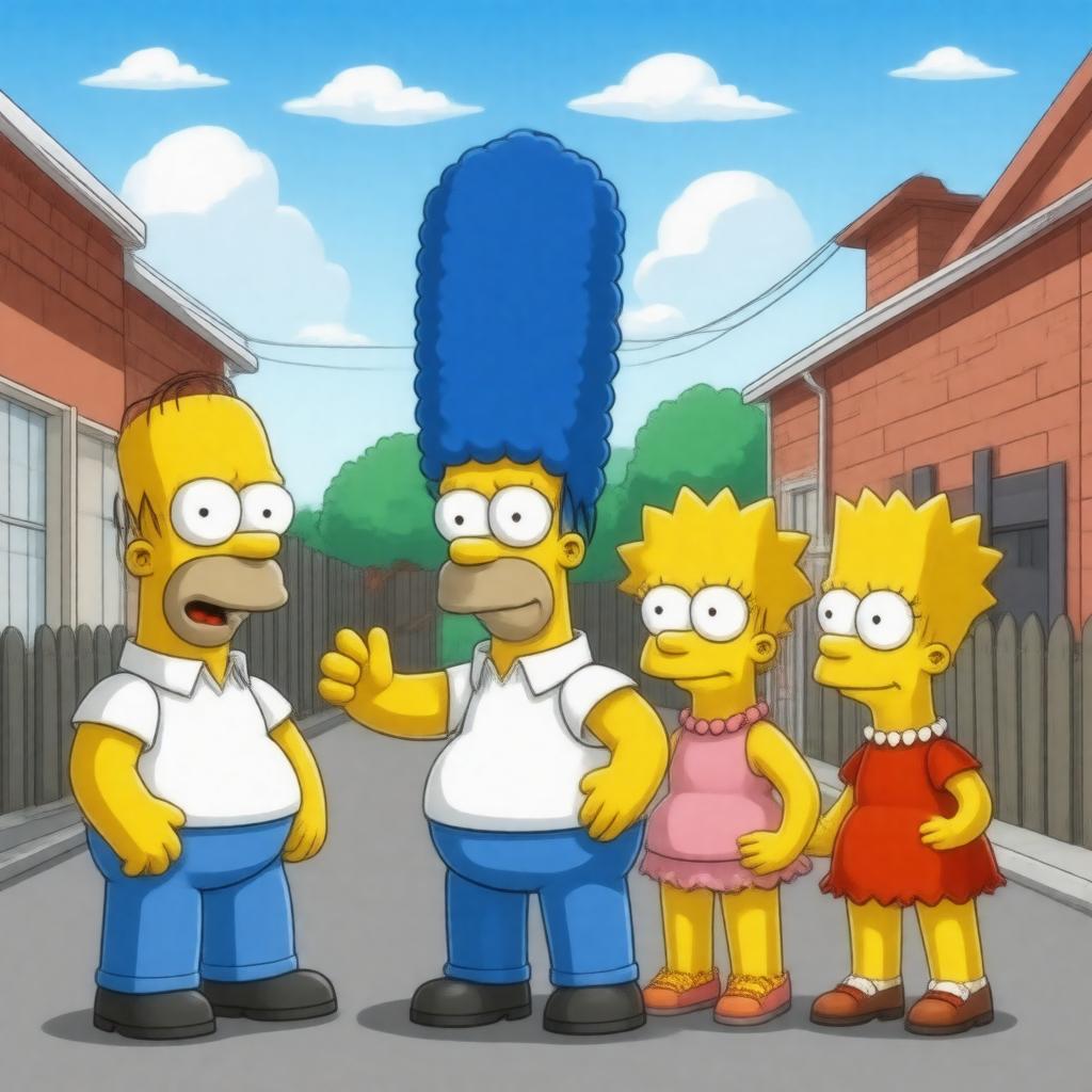 "Generate an image of a screenshot from The Simpsons Game, a cel-shaded, action-adventure platformer video game, featuring Homer Simpson, Marge Simpson, Bart Simpson, Lisa Simpson, and Maggie Simpson in a humorous, cartoonish scene set in Springfield, with a parody twist on popular video game culture, reminiscent of Grand Theft Scratchy and Medal of Homer, in a style that blends 3D graphics with a comic book aesthetic."