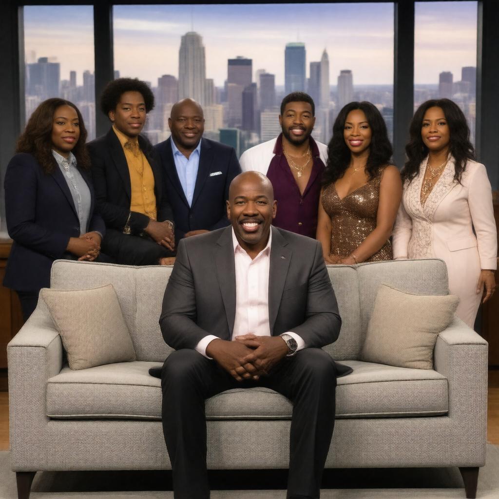 "Generate an image of a sitcom studio setting with a multi-camera setup, featuring Steve Harvey sitting on a couch, surrounded by the main cast including Cedric the Entertainer, Merlin Santana, Wendy Raquel Robinson, Terri J. Vaughn, William Lee Scott, and Lori Beth Denberg, with a Chicago cityscape visible through the studio window, representing The Steve Harvey Show, a popular American sitcom that aired from 1996 to 2002."
