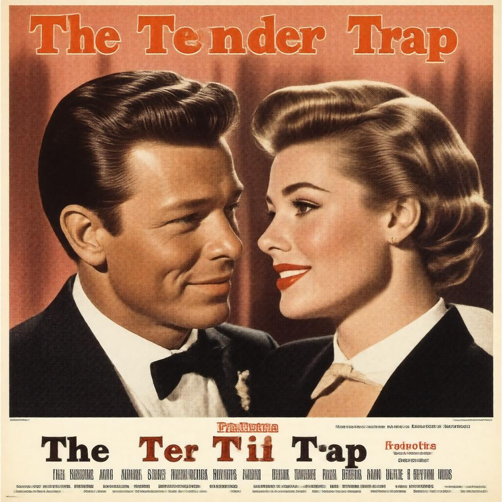 "Create an image of a 1955 romantic comedy film poster for 'The Tender Trap', starring Frank Sinatra and Debbie Reynolds, with a nostalgic and classic Hollywood feel, incorporating elements of music and romance, in a style reminiscent of 1950s film posters."