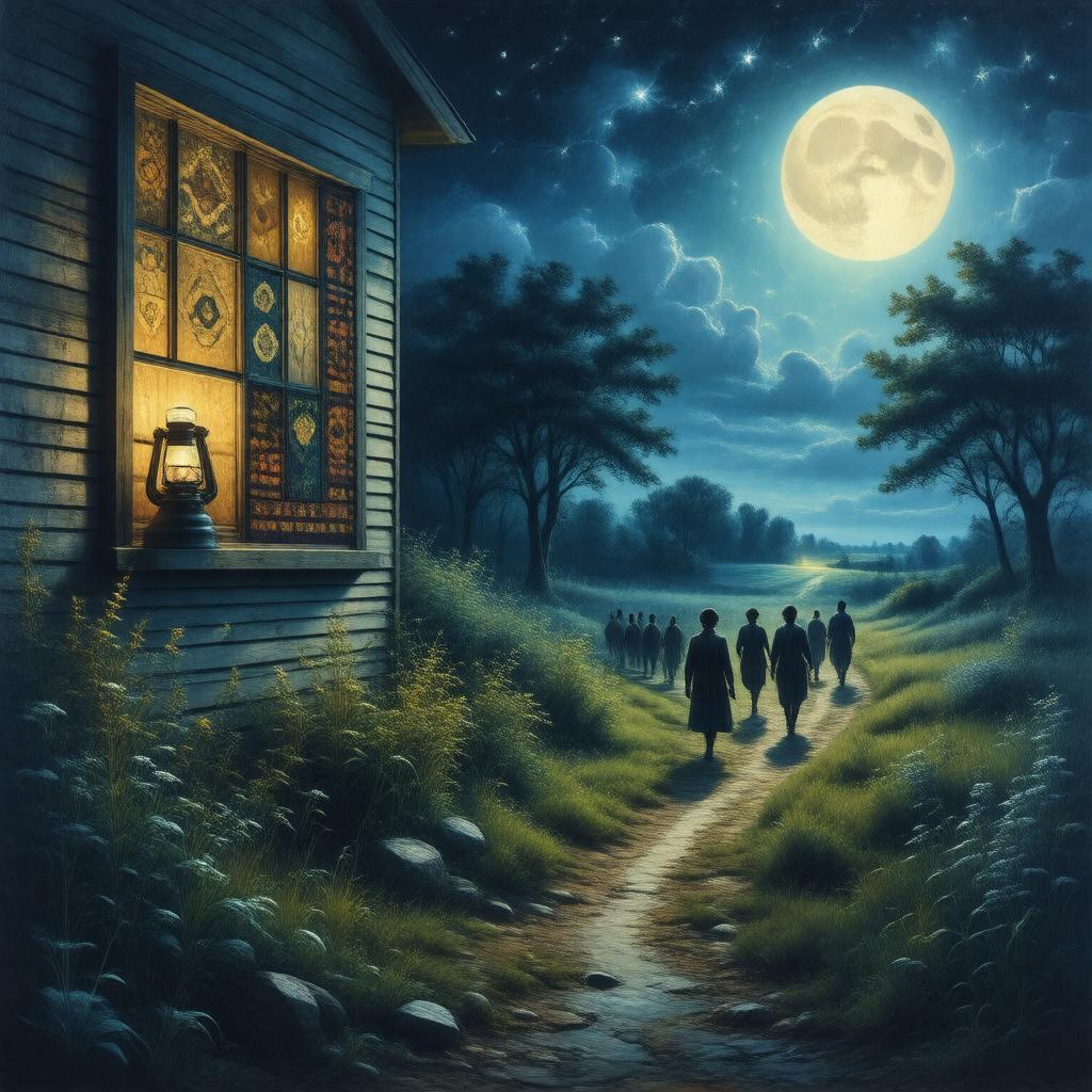 "Create an image of a serene and symbolic nighttime scene depicting the Underground Railroad, a historical network. Show a lantern-lit window in a rural home, with a quilt hanging outside, subtly displaying coded patterns. In the distance, silhouettes of people, led by a figure resembling Harriet Tubman, move stealthily along a winding path towards freedom in the Northern United States. Incorporate elements of nature, such as stars and a full moon, to represent guidance and hope. The style should be evocative and dreamlike, conveying the courage and resilience of those who used this secret network to escape slavery in the mid-19th century."