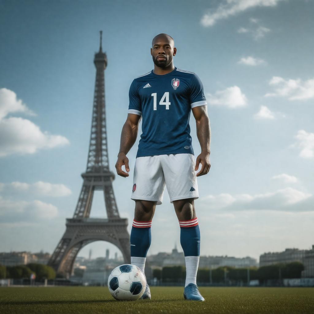 "Generate a realistic image of Thierry Henry, a renowned French former professional footballer and current sports analyst, standing confidently with a football at his feet, wearing a French national team jersey with the number 14, with the Eiffel Tower in the background, symbolizing his pride and achievements in the sport, in a style that blends realism with a touch of elegance."