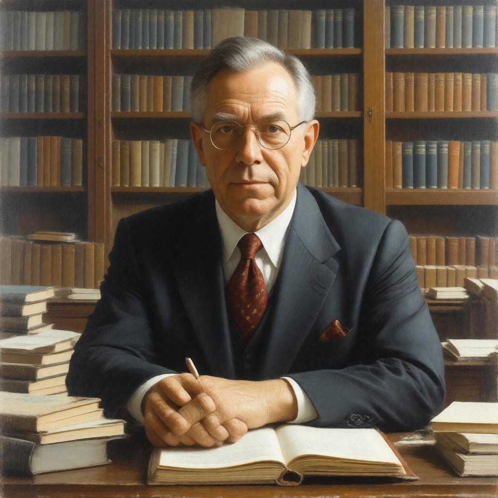 "Create a realistic portrait of Thomas Sargent, a middle-aged American economist with a gentle expression, wearing a suit and tie, sitting in a library with books and papers around him, conveying a sense of intellectual curiosity and authority in his field of macroeconomics and econometrics."