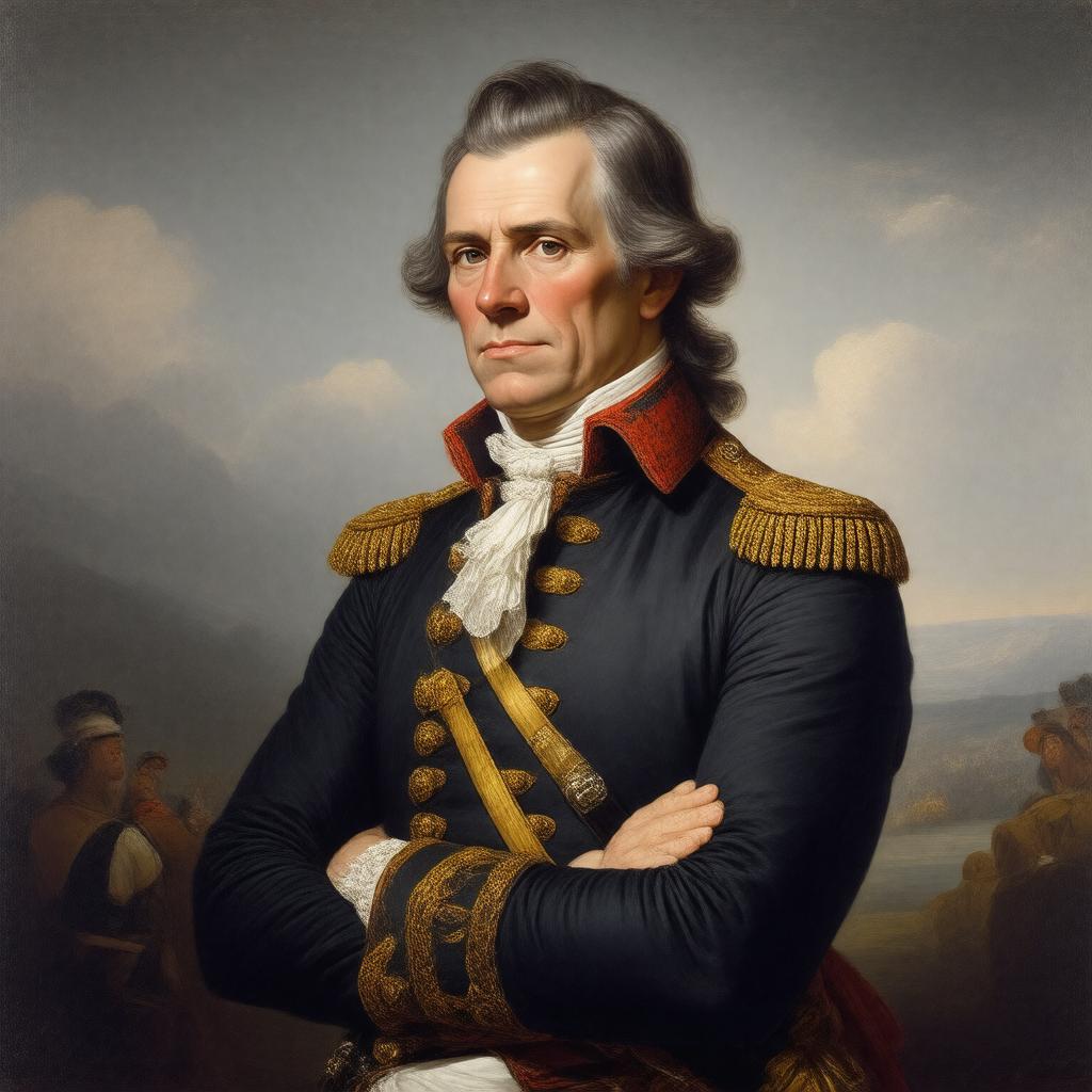 Create an image of Thomas Sumter, a Brigadier General in the Continental Army during the American Revolutionary War, also known as "The Carolina Gamecock". He should be depicted in his late 18th century military attire, with a stern expression, standing proudly with his arms crossed, symbolizing his bravery and leadership. The background should be a subtle representation of the American Revolutionary War era, possibly with a hint of the South Carolina landscape. The style should be realistic, reminiscent of 18th-century portraiture, with attention to detail in his uniform and facial features.