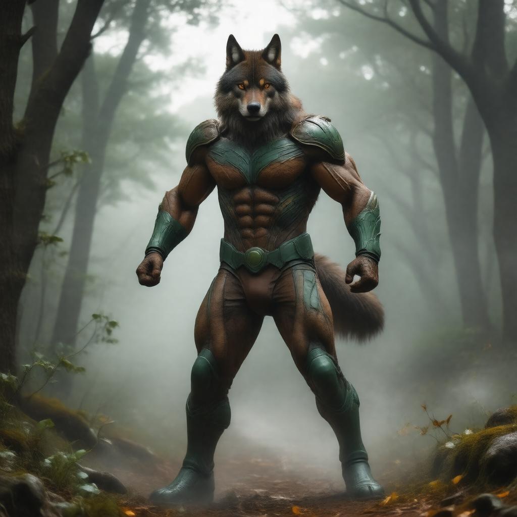 "Generate an image of a male Timber Wolf, a metahuman superhero from the planet Zuun, wearing a brown and green costume, standing in a powerful pose with a fierce expression, showcasing his superhuman strength, agility, and enhanced senses, set against a backdrop of a misty forest, symbolizing his connection to his homeworld and his alter ego, Lone Wolf."