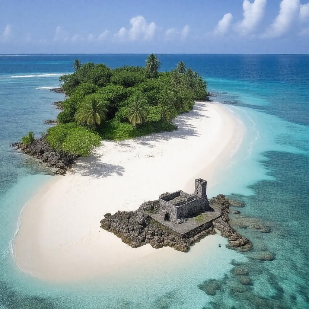"Generate an image of a tropical island with white sandy beaches, crystal-clear waters, and lush green vegetation, representing Tinian Island, which is located in the Pacific Ocean and part of the Northern Mariana Islands, with a few historic military ruins and a scenic coastline, in a realistic style."