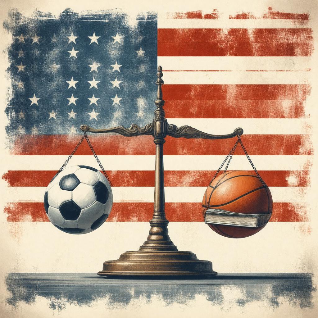 "Create an image of a symbolic representation of equality, featuring a balance scale with a sports equipment, such as a soccer ball and a basketball, on one side and a book or a educational scroll on the other, set against the backdrop of the American flag, with a subtle pattern of a school or university building in the background, representing the impact of Title IX on education and athletics, in a style that conveys a sense of fairness and justice."