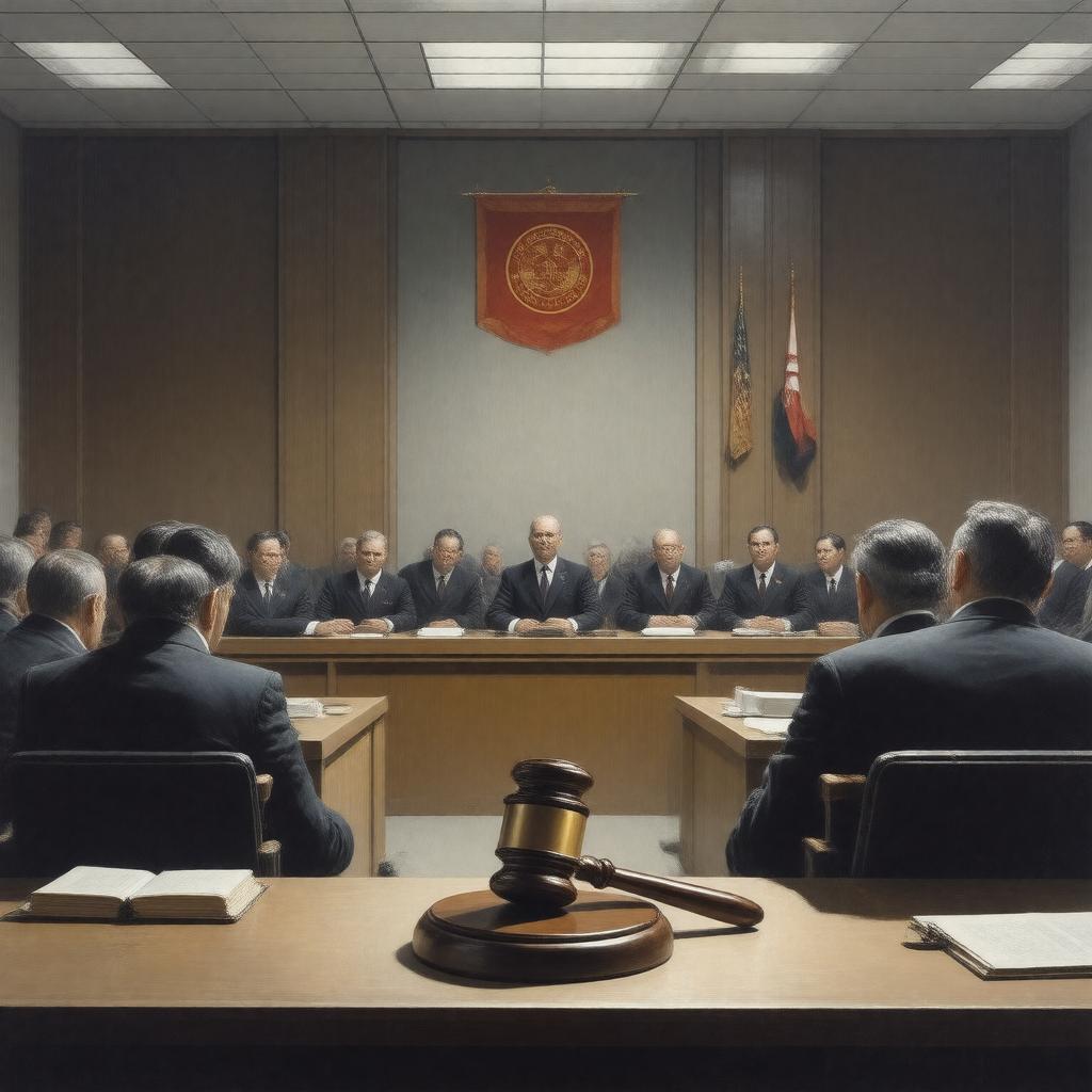 "Generate an image of a courtroom scene set in Tokyo, Japan, during the International Military Tribunal for the Far East, also known as the Tokyo Trials. The image should depict a realistic and solemn atmosphere, with judges, prosecutors, and defendants seated at their respective tables. In the background, a large wooden gavel and a banner with the tribunal's name should be visible. The style should be a realistic and dramatic representation of this historical event, with muted colors and a focus on conveying the gravity and importance of the trial. The image should be a documentary-style illustration, rather than a cinematic or artistic rendering."