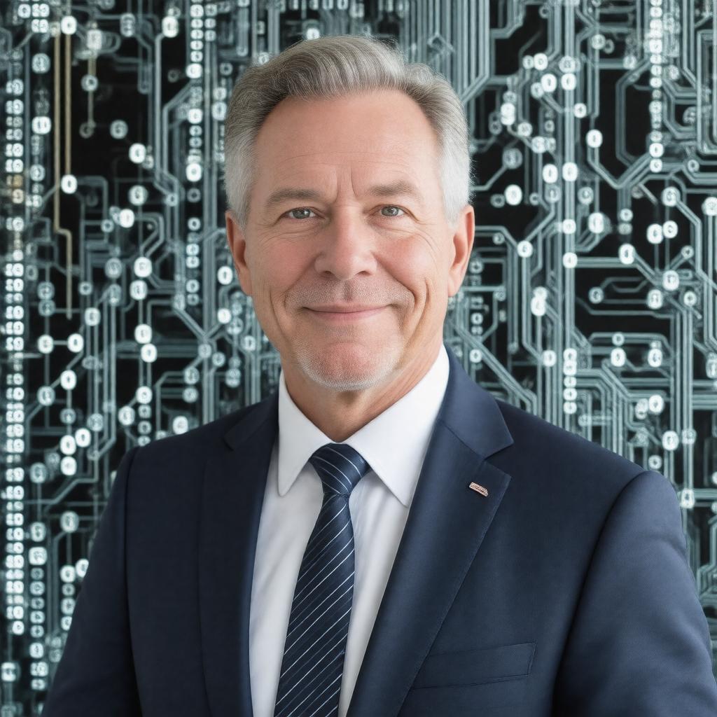 Generate a realistic image of Tom Leighton, a middle-aged American man with a professional demeanor, wearing a suit and standing in front of a background that represents his work in technology, such as a subtle pattern of computer circuits or a large screen displaying code. He should be posed in a confident and approachable manner, with a slight smile, conveying his role as a leading figure in computer science and as the CEO of Akamai Technologies. The style should be formal and professional, reflecting his achievements and positions.