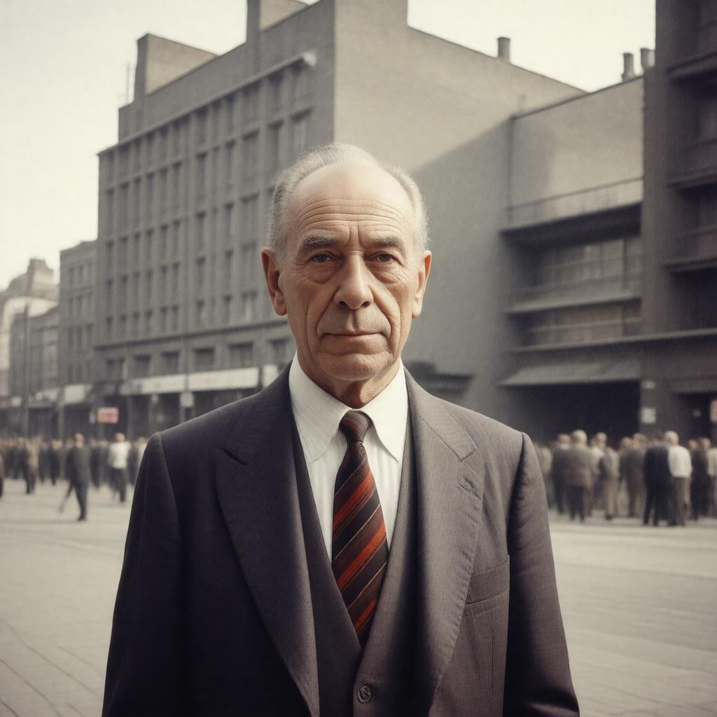 Generate a realistic image of a French architect and urban planner from the early 20th century, standing in front of one of his notable works, such as the Cité Industrielle or the Stade de Gerland, with a mix of modernist and industrial elements in the background, wearing formal attire typical of the era, with a confident and visionary expression, in a style that blends realism with a hint of nostalgia.