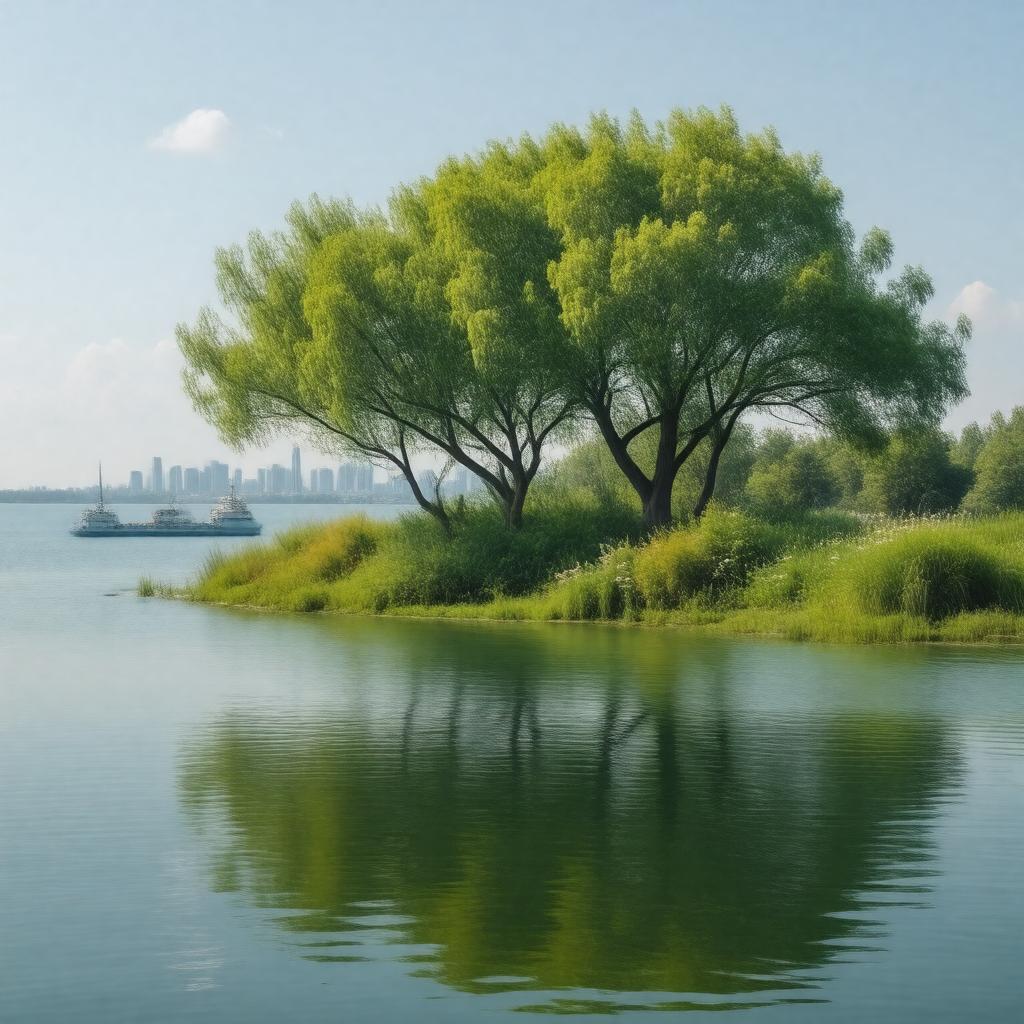 "Generate an image of a scenic view of the Toronto Islands, showcasing its lush vegetation, including willow trees, maple trees, and wildflowers, with Centre Island, Ward's Island, and Hanlan's Point in the background, and a ferry or ship in the distance, under a sunny sky with a few clouds, in a realistic and serene style."