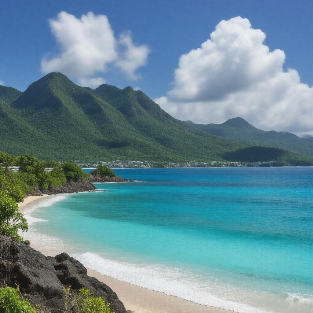 "Generate an image of a scenic view of Tortola, the largest island in the British Virgin Islands, with crystal-clear turquoise waters, lush green mountains, and a picturesque beach in the foreground, with the island's capital, Road Town, visible in the distance, under a bright blue sky with a few puffy white clouds, in a realistic and vibrant style."
