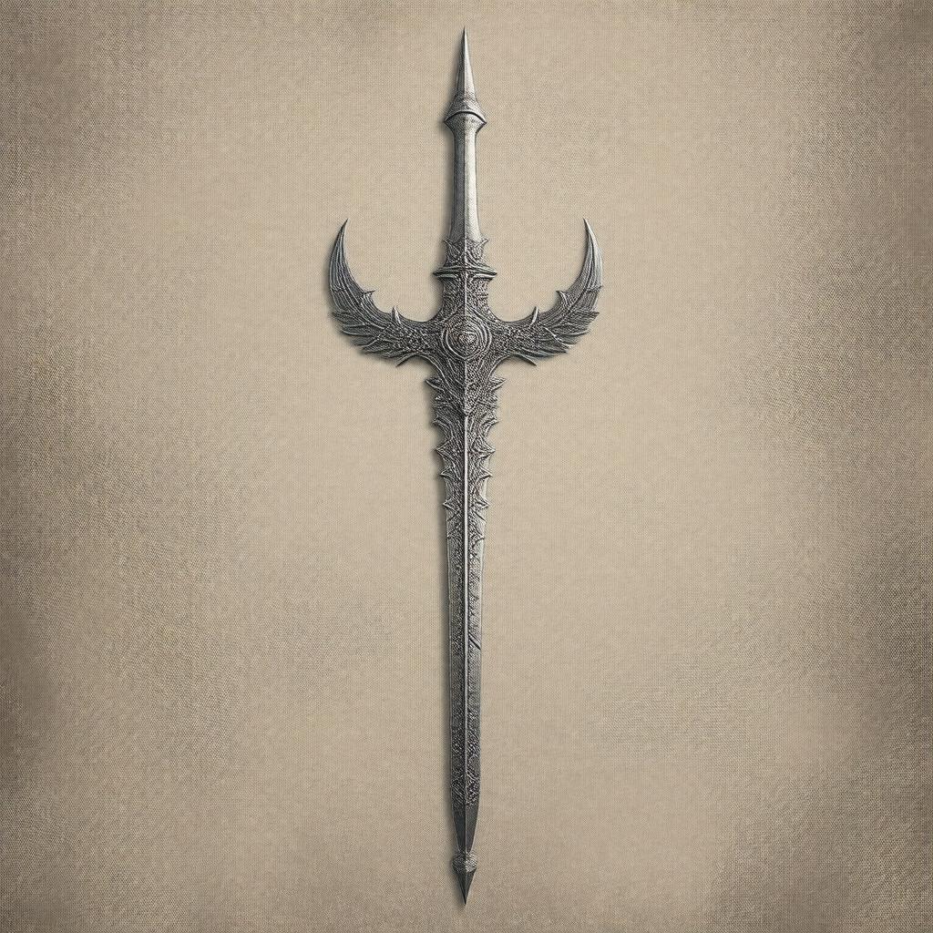 "Generate an image of a Trishula, a mythological sword and religious symbol, with three prongs, a long shaft, and a metal construction, often associated with Shiva, Durga, and Kali, and used in Hinduism, Buddhism, and Jainism, symbolizing creation, preservation, and destruction, in a traditional Indian style, reminiscent of ancient temple carvings or iconography."