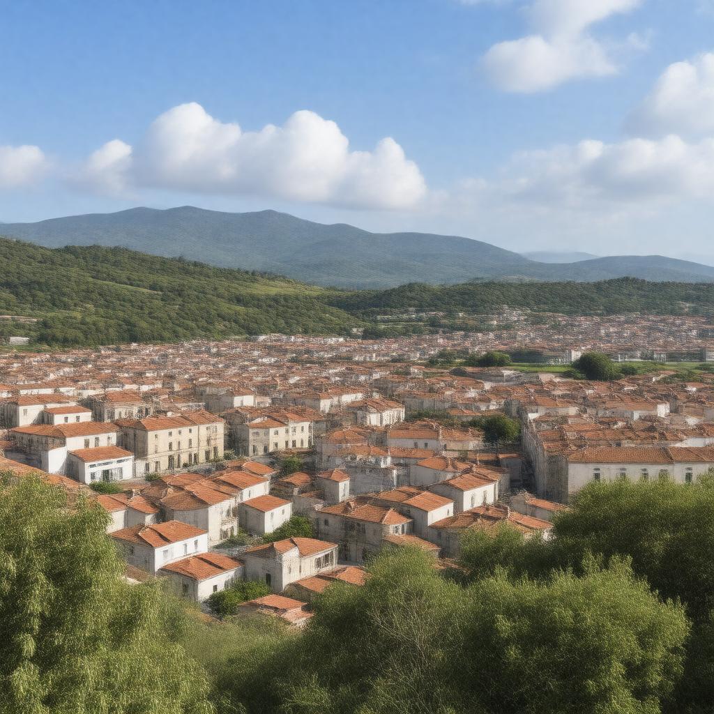 Generate a realistic image of a municipality in Portugal, specifically Trofa, showcasing its town center with historic buildings, surrounded by lush green hills and mountains in the background, under a clear blue sky with a few puffy white clouds, incorporating modern Portuguese architectural styles and a subtle hint of the region's rich cultural heritage.