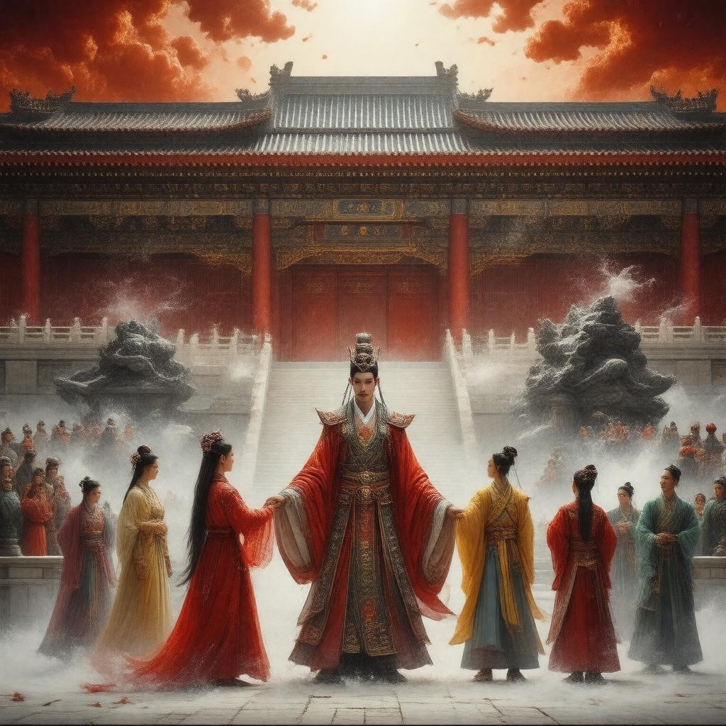 "Create an image of a grand opera scene set in ancient China, featuring Princess Turandot, Calaf, Liù, and Timur. The backdrop should be the imposing walls of the royal palace. Incorporate elements that reflect the opera's themes of riddles, love, and sacrifice. The style should be reminiscent of 20th-century opera productions, with vibrant colors and dramatic lighting. The image should evoke the opulence and majesty of Giacomo Puccini's Turandot, as famously produced by Zeffirelli at the Metropolitan Opera."