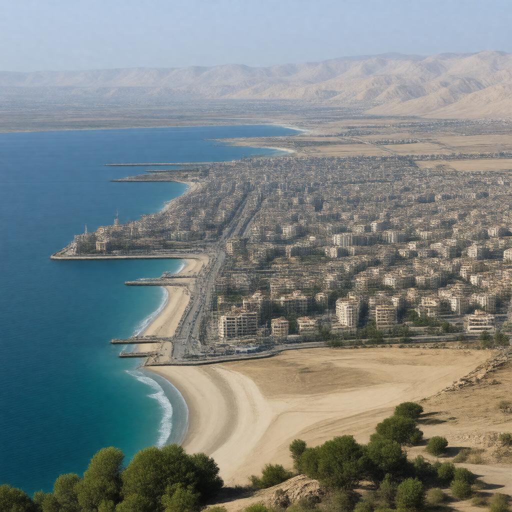 "Generate a realistic image of a coastal city with a port, situated on the shores of the Caspian Sea, with a backdrop of desert landscape. The cityscape should feature a mix of modern and industrial buildings, including an international seaport and airport. Include a beach, such as Awaza, and showcase the city's elevation of 27m above sea level. The image should be in a style that reflects a desert climate, with a color palette that captures the essence of a city in Turkmenistan. The city should be identifiable as Turkmenbashi, formerly known as Krasnovodsk, with a notable presence of oil refining, shipping, and fishing industries. Depict the city in a daytime setting with a clear sky."
