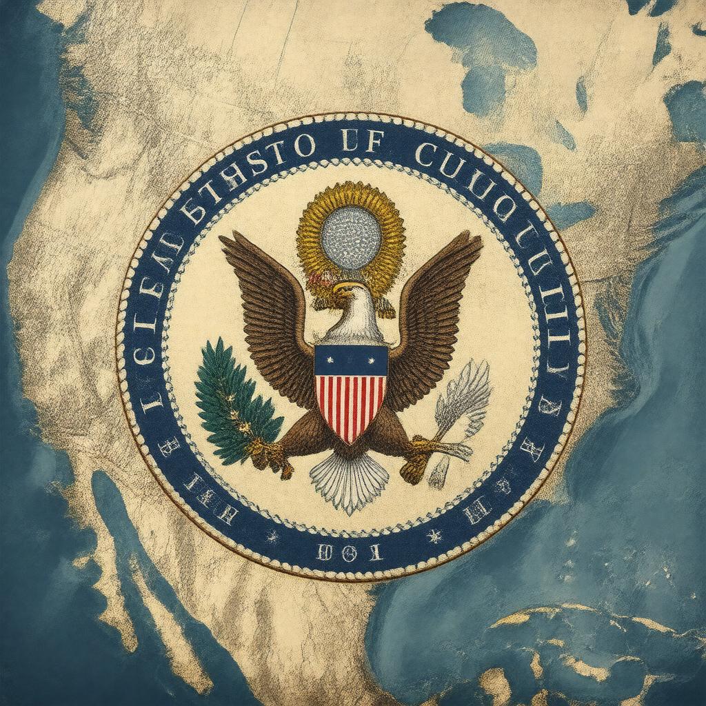 "An official seal or logo of the U.S. Census Bureau, set against a backdrop that represents the United States, possibly with a subtle map or iconic American imagery. The style should be professional and governmental, reflecting the agency's role and importance. Incorporate the U.S. Census Bureau logo (https://upload.wikimedia.org/wikipedia/en/8/8c/US_Census_Bureau_seal.png) or a similar representation into the scene."