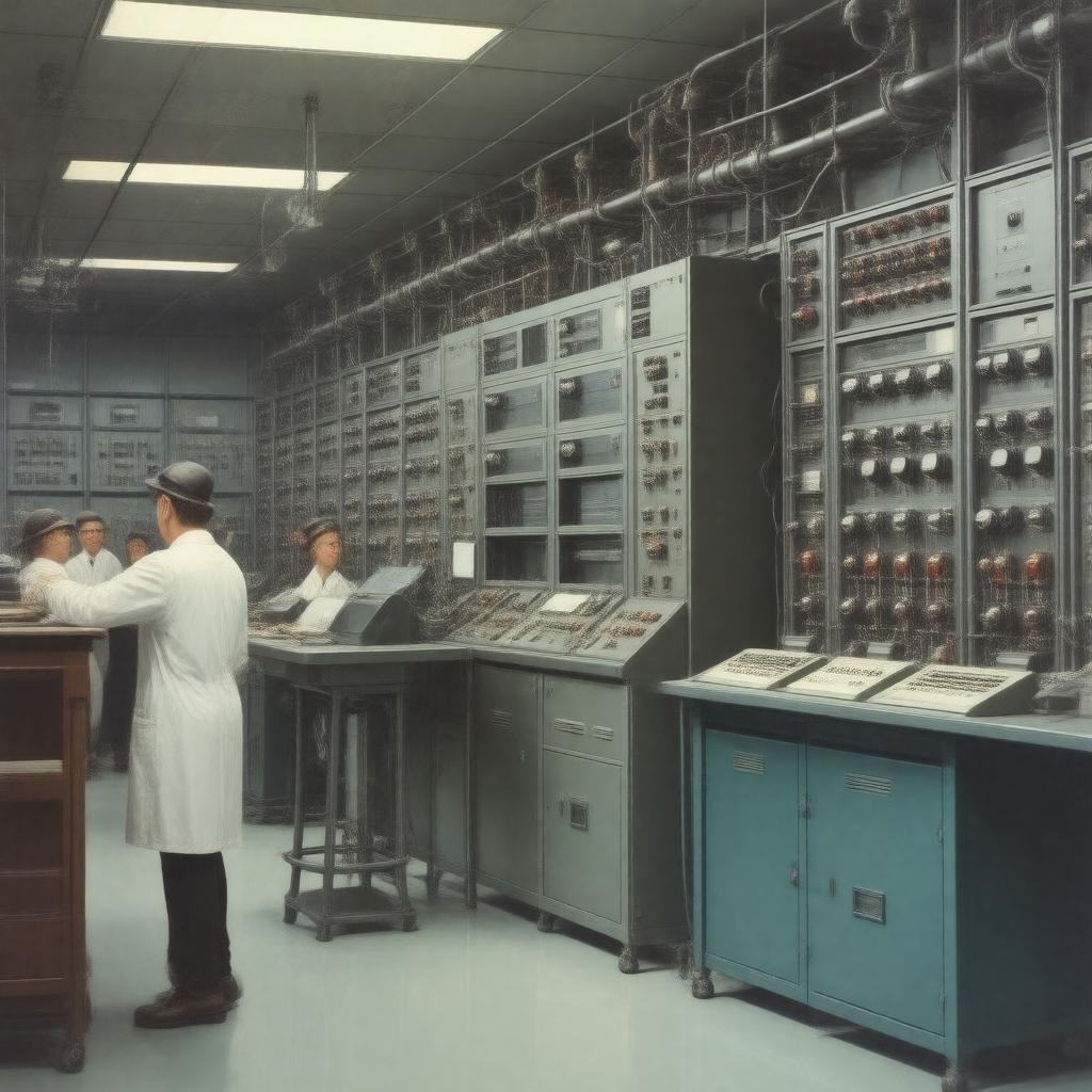 "Create a realistic image of a vintage mainframe computer, specifically the UNIVAC I, in a 1950s-style data processing room. The UNIVAC I should be prominently displayed, with magnetic tapes and vacuum tubes visible. In the background, operators in lab coats and hats should be working at control panels. The room should have a metallic and industrial feel, with rows of computer equipment and blinking lights. Incorporate subtle hints of the era, such as old telephones and rotary dials. The overall style should be nostalgic and documentary-like, evoking a sense of historical significance and technological innovation."