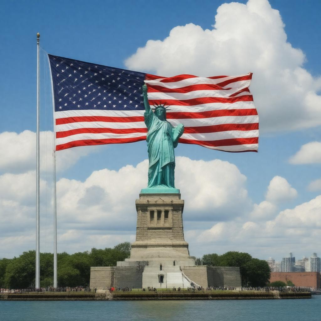 "Generate an image of a representative landmark of the United States of America, depicting a scenic view of the American flag waving in front of a majestic landscape featuring the Statue of Liberty, symbolizing freedom and democracy, in a realistic style with vibrant colors, set against a bright blue sky with white clouds, incorporating iconic American elements."