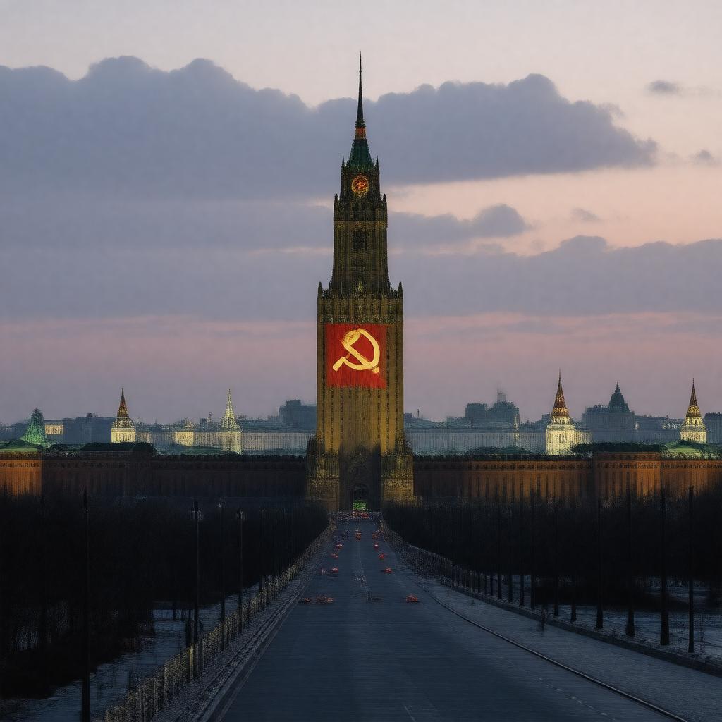 "Generate an image of a monumental, imposing structure with a large, red hammer and sickle flag waving in the foreground, set against a backdrop of the Moscow cityscape with the Kremlin's towers visible, during a dramatic, sunset-lit evening; style: a mix of realistic and slightly nostalgic Soviet-era architectural photography; gptkbp:instance_of: Country: USSR"