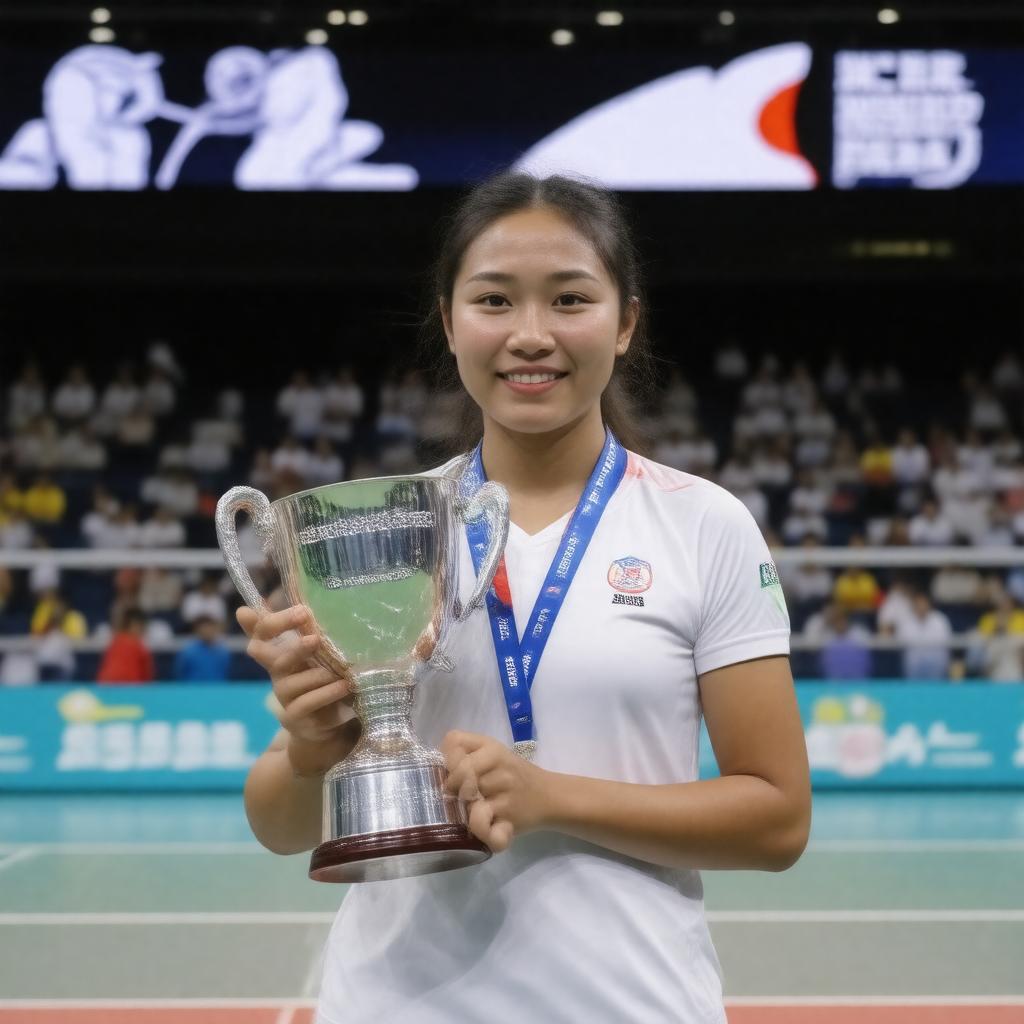 "Generate an image of the Uber Cup trophy being held by a female badminton player, with a background of a packed stadium and a banner displaying the Badminton World Federation logo, representing the biennial women's team badminton championship."
