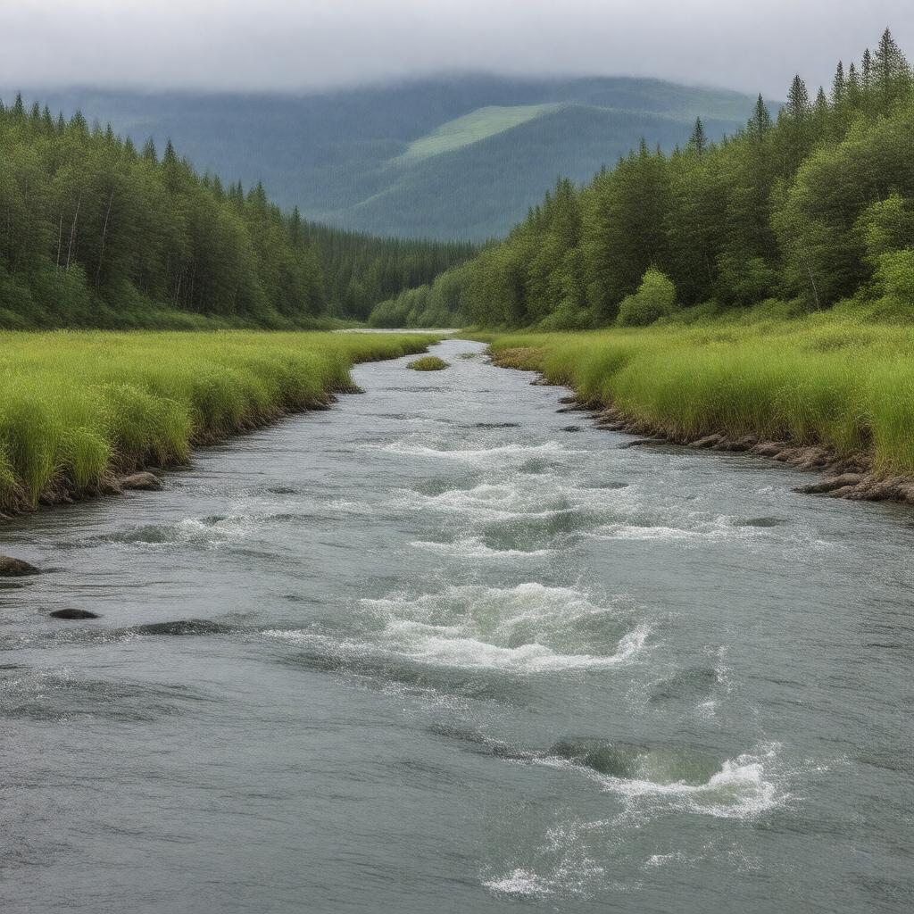 "Generate a serene landscape image of the Ugashik River, a 43-mile-long river located in Alaska, flowing through the Bristol Bay region and emptying into Ugashik Bay. The image should feature the river's tranquil waters, surrounded by lush greenery and possibly showcasing salmon swimming in the river, highlighting its notable salmon runs. In the background, capture the majestic scenery of the Alaskan wilderness. The style should be realistic and reminiscent of a nature photograph, with a focus on conveying the natural beauty and peaceful atmosphere of the Ugashik River."