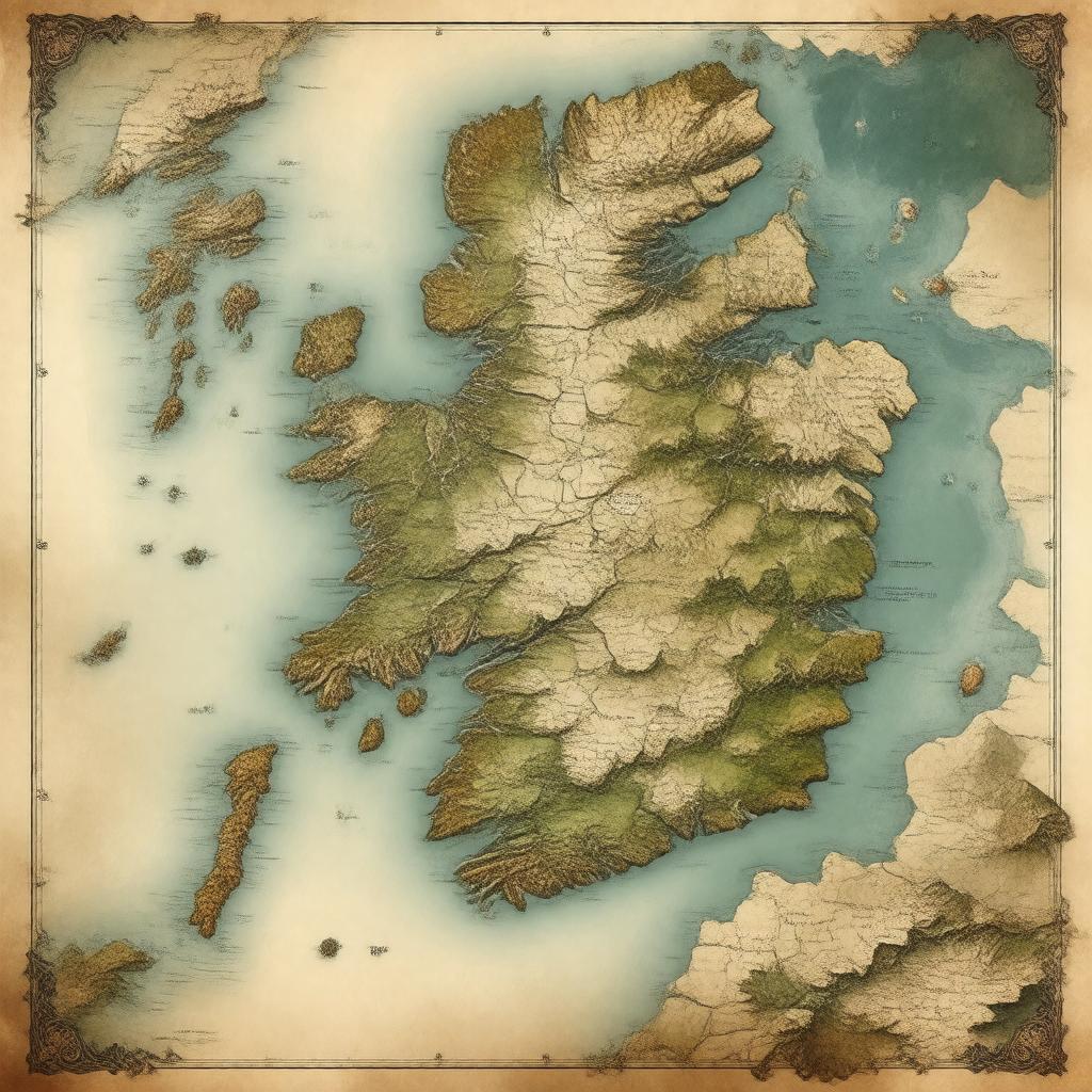 "Generate an image of a traditional Ulster Scots language map, highlighting the regions in Northern Ireland, County Donegal, and Ulster where the language is spoken, with a subtle background texture resembling a vintage parchment, and incorporating the Ulster Scots language's logo or symbol, in a style that reflects the language's cultural heritage and history."