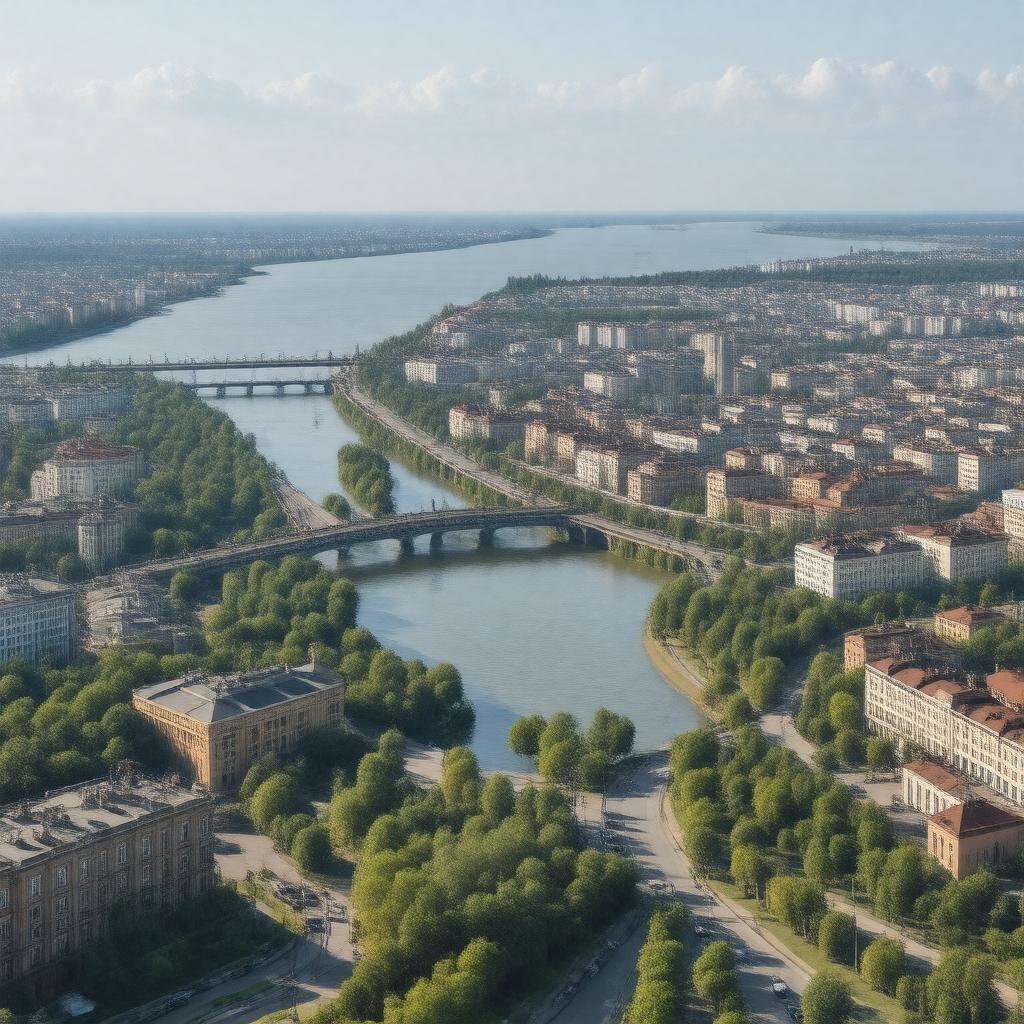 "Generate a realistic image of Ulyanovsk, a city located on the Volga River in Russia, with a humid continental climate, featuring notable landmarks such as the President Bridge, Imperial Bridge, Lenin Memorial Museum, and Ulyanovsk Drama Theater, surrounded by a landscape reflecting its elevation of 139m, in a style suitable for a city with a population of over 600,000."